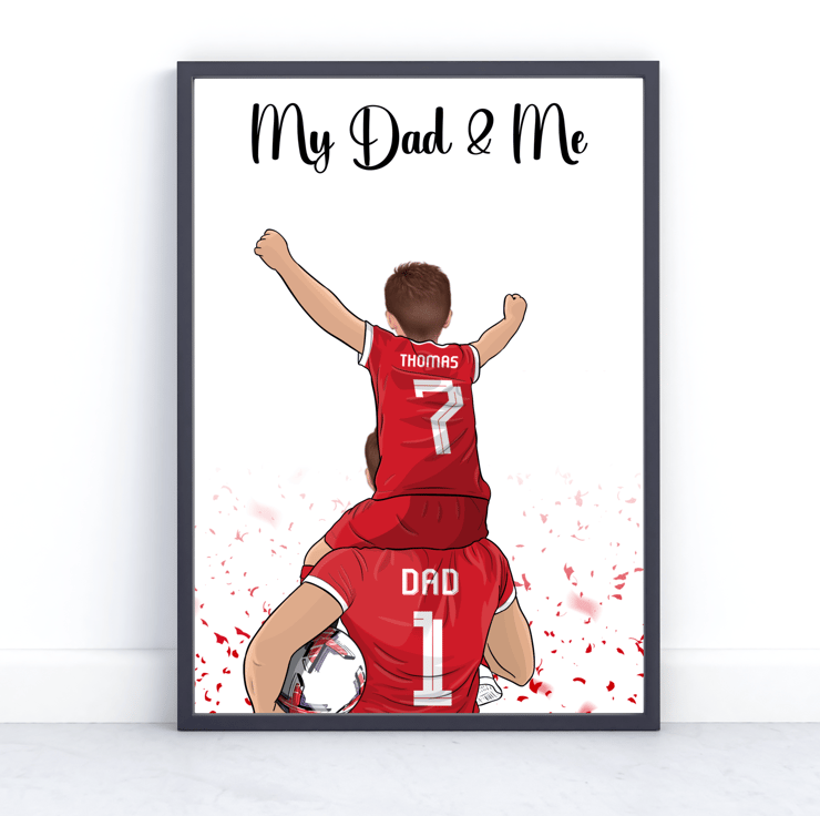 This beautiful piece features a loving parent with their child on their shoulders, both dressed in football shirts with custom names and numbers on the back. Perfect for any football fan, this print is sure to be a treasured addition to any home.
