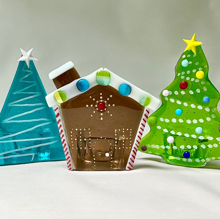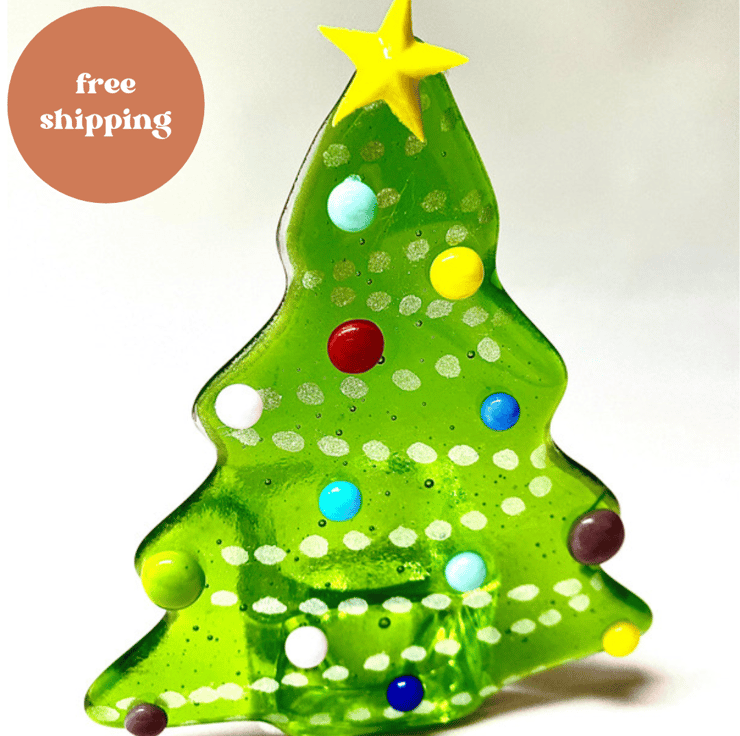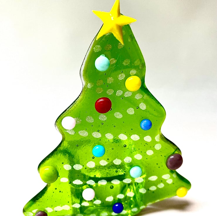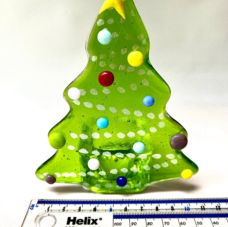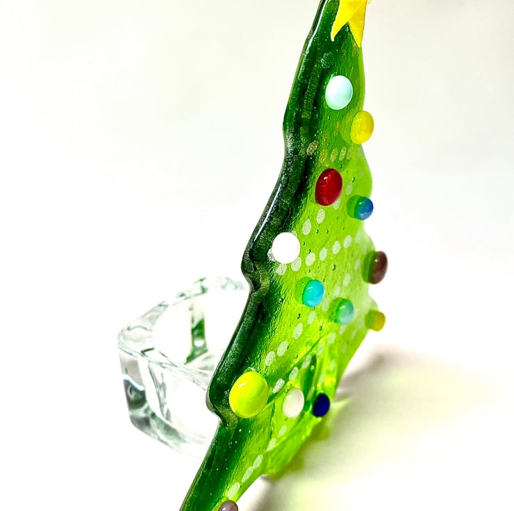This vibrant glass Christmas tree was made from a layer of hand cut green glass, fused to a clear glass base. It was fused into one piece in a specialist kiln over a 12 hour firing to 800 degrees Celsius. Once cooled, the decorative accents were added including hand painted lights in pearlescent silver and a pre-fired yellow star placed at the top before being fired again to fix to the tree base. The final part was to fix a glass tea light candle holder to the back to allow it to stand as a decorative festive feature.