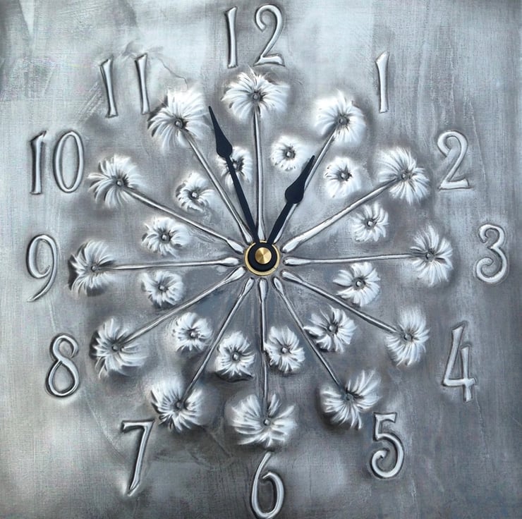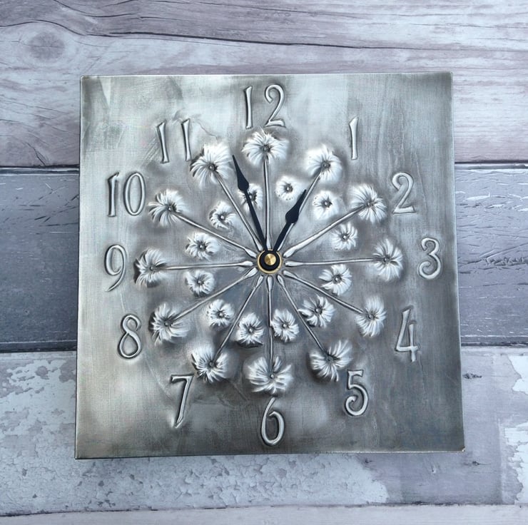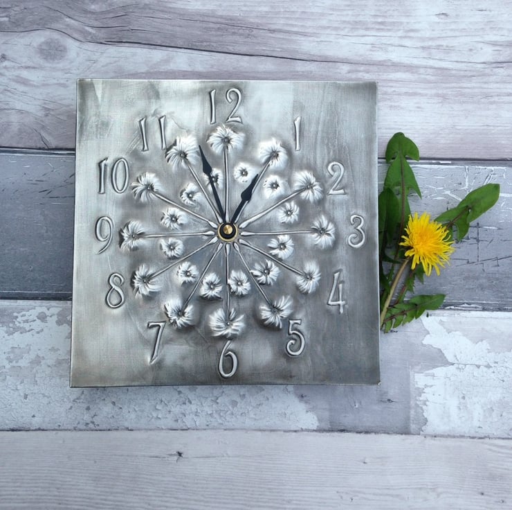 Art nouveau style pewter wall clock in the dandelion design. The clock measures 20cm square and is made from lead free pewter mounted over MDF board. The pewter requires no maintenance and will not tarnish. The clock design is made by hand gently pushes the metal into the design before it is mounted onto board for rigidity and then patinated and polished. the clock mechanism is a German style quartz clock and required 1xAA battery. The clock would make a lovely and unusual gift.