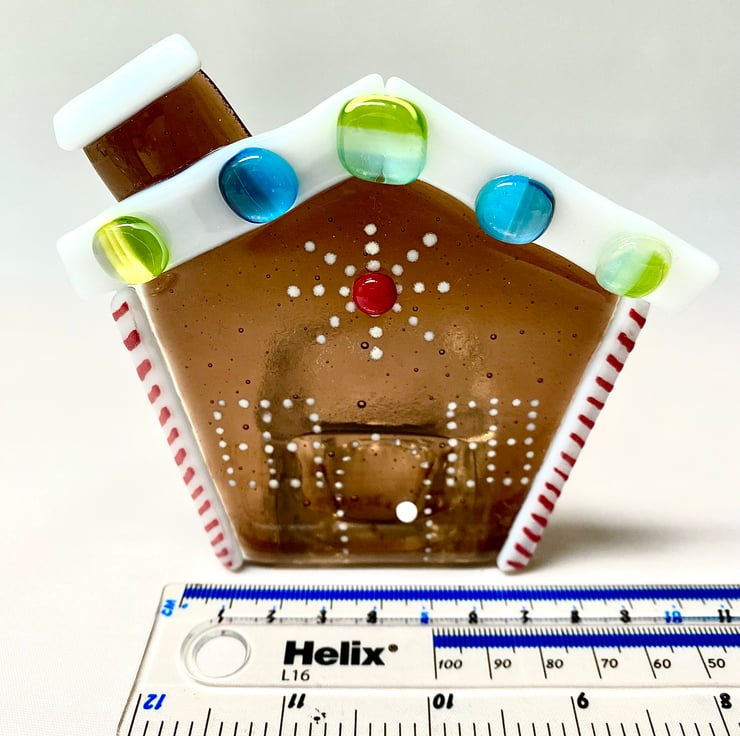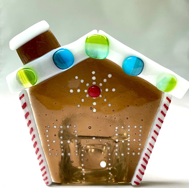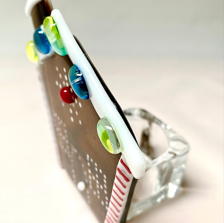 This vibrant glass gingerbread house was made from a layer of hand cut brown glass, fused to a clear glass base. It was hand decorated with glass paint to create the door and windows. It was fused into one piece in a specialist kiln over a 12 hour firing to 800 degrees Celsius. Once cooled, the snow, candy canes and decorative accents (all handmade) were added before being fired again to fix to the house base. The final part was to fix a glass tea light candle holder to the back to allow it to stand as a decorative festive feature.