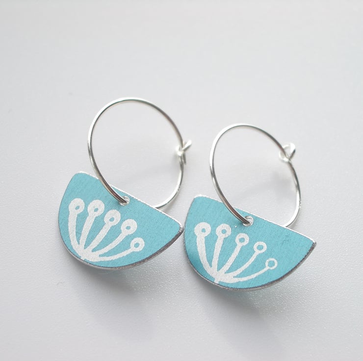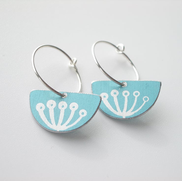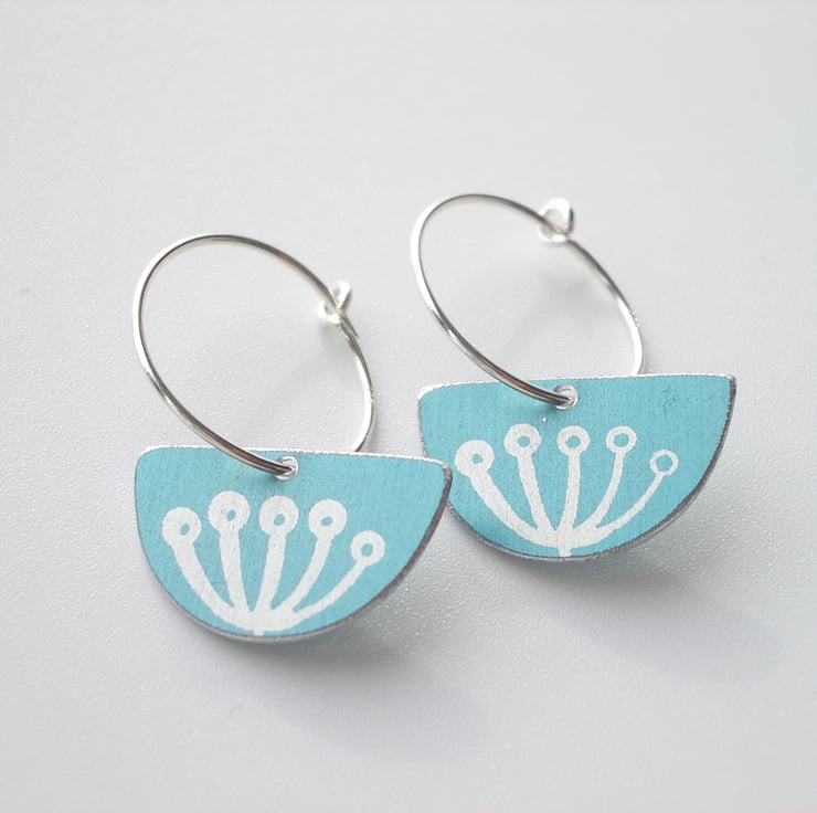 These cute little semi circle earrings are made from aluminium which I have a dyed in duck egg blue and printed with silver cow parsley prints. The dye is made permanent through heat and the colour becomes part of the metal. I cut out the semi circle shapes by hand using a jewellers saw and file the edges to give a nice finish. Finally I have hung them on 15mm sterling silver hoops. The semi circles measure approximately 17mm x 10mm.