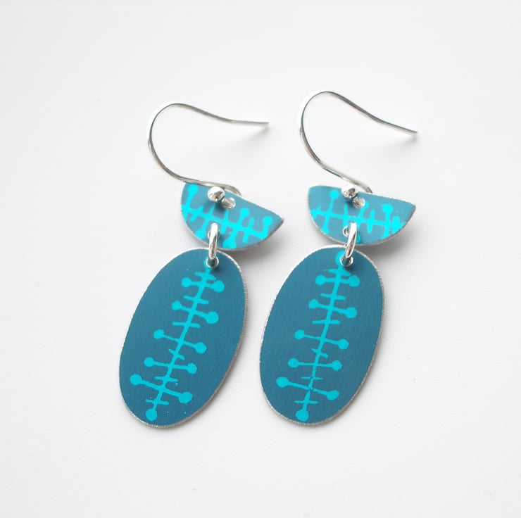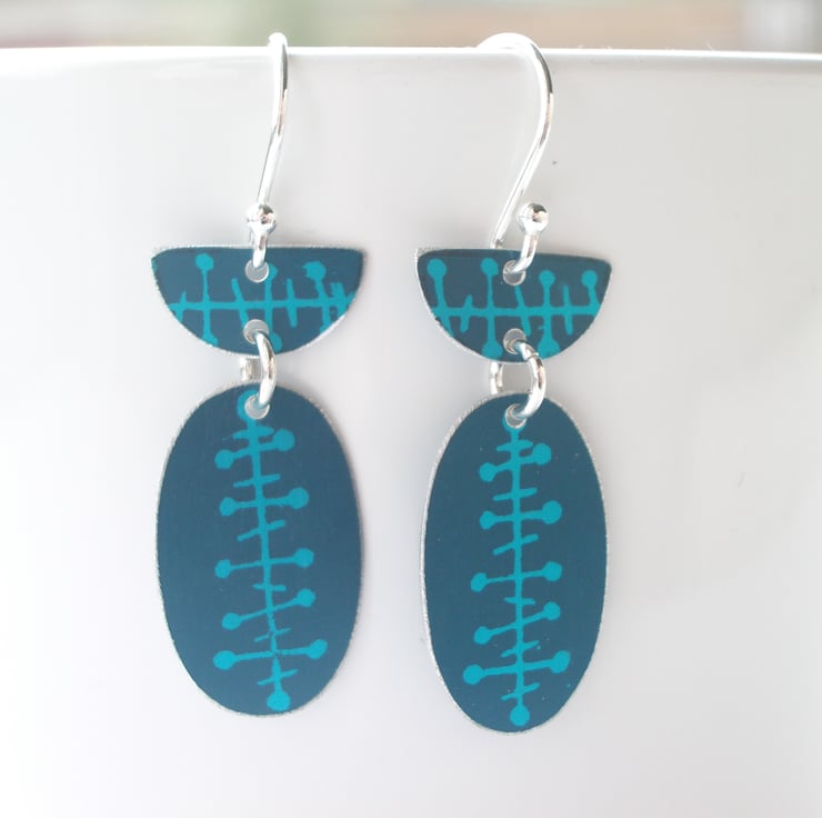 These lightweight unusual earrings are made from anodised aluminium which I have dyed in teal and then printed with a mid-century style design. I cut the shapes using a jeweller’s saw and file the edges to give a nice smooth feel. They hang from sterling silver ear hooks and measure approximately 28mm x 13mm.