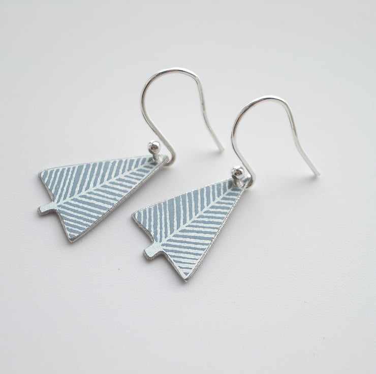 These cute scandi style Christmas tree earrings are made from aluminium which I have printed and dyed in grey with silver details. I file the edges to reveal the shiny aluminium on the edges which gives a nice smooth finish.