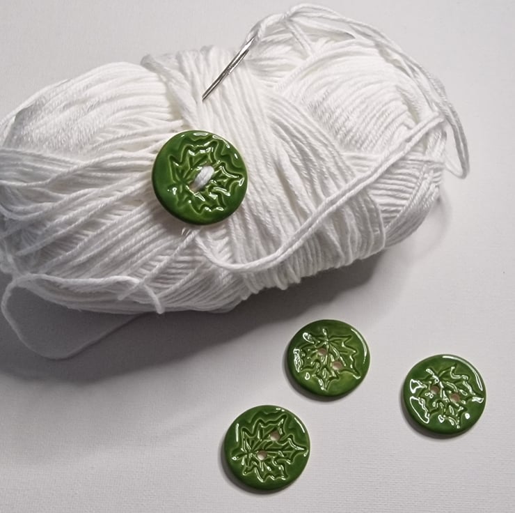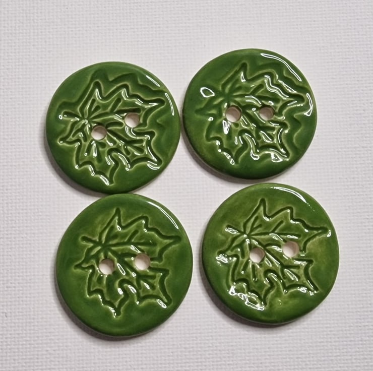 Set of four green handmade ceramic buttons with a leaf motif. Unique buttons.