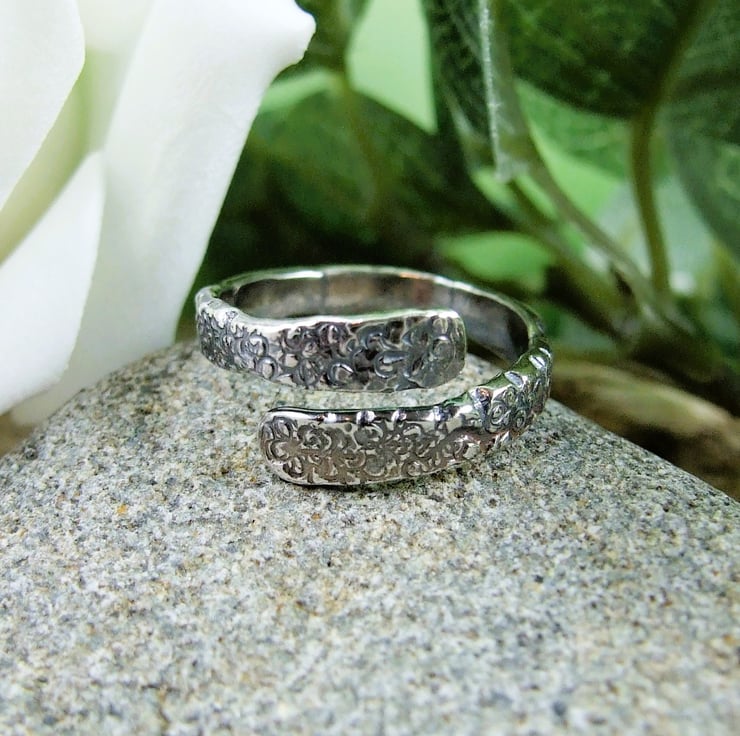 I have made the ring from 2.5mm thick sterling silver wire. The pattern has been created by hammering a variety of steel punches on the surface to create a rustic texture. I have rounded the ends and shaped to fit a UK size M-N. Please let me know if you would like the ring adjusted to your size, can be altered to between UK L-O.