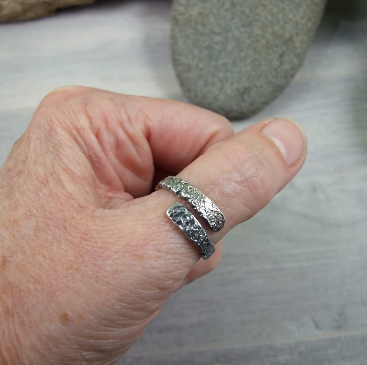 I have made the ring from 2.5mm thick sterling silver wire. The pattern has been created by hammering a variety of steel punches on the surface to create a rustic texture. I have rounded the ends and shaped to fit a UK size M-N. Please let me know if you would like the ring adjusted to your size, can be altered to between UK L-O.