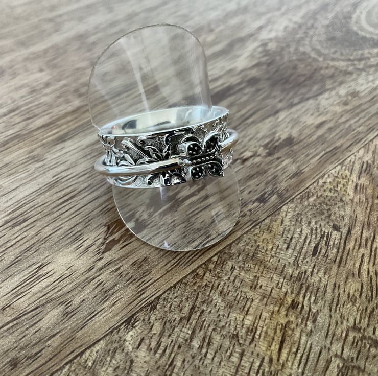 A beautiful spinning ring with a silver band holding a butterfly which circles around a larger band which is floral patterned. Not only does it look great but it can also be used as a helpful tool to calm anxiety and relieve stress.