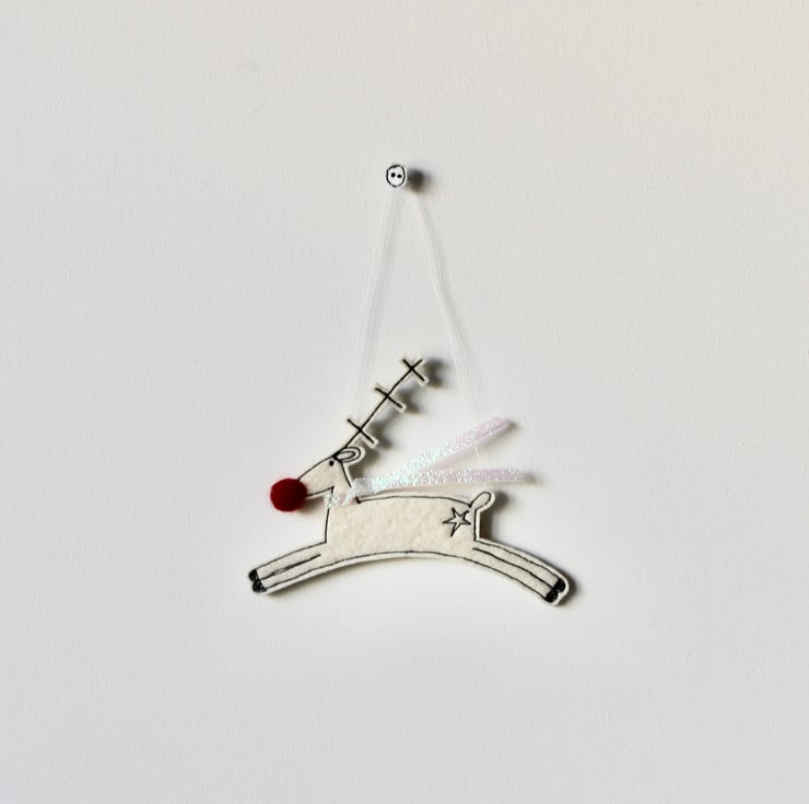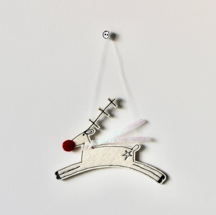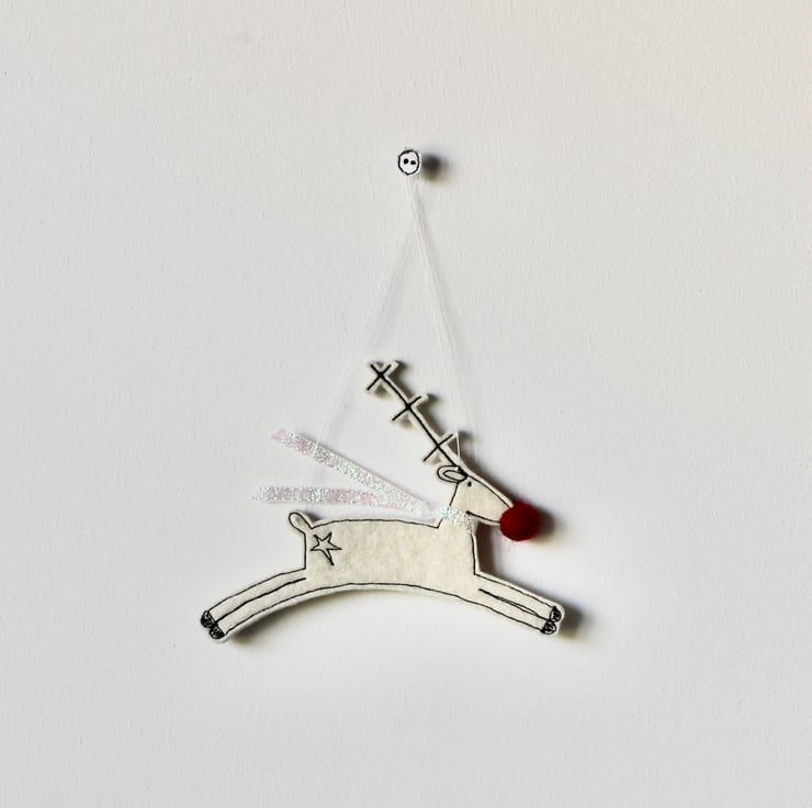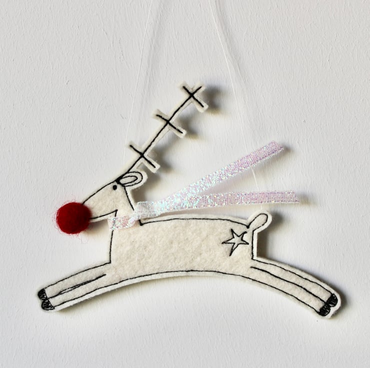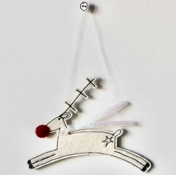 A delightful hanging decoration which is created using 100% wool felt, glitter ribbon, a wool felt ball and free hand machine embroidery; it is cut out by hand, using a very sharp pair of scissors.