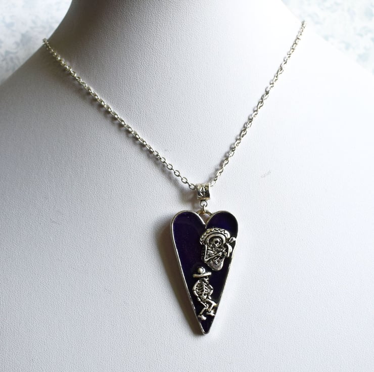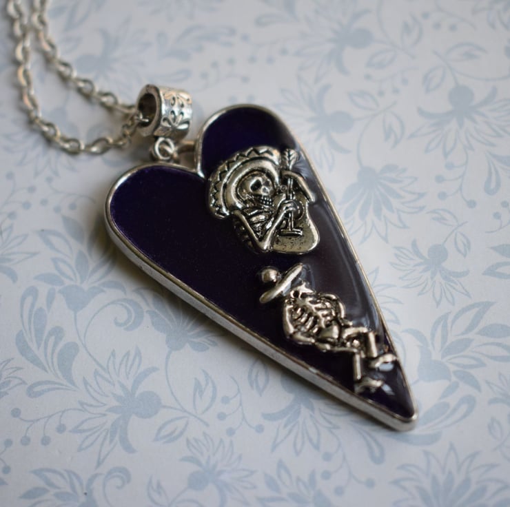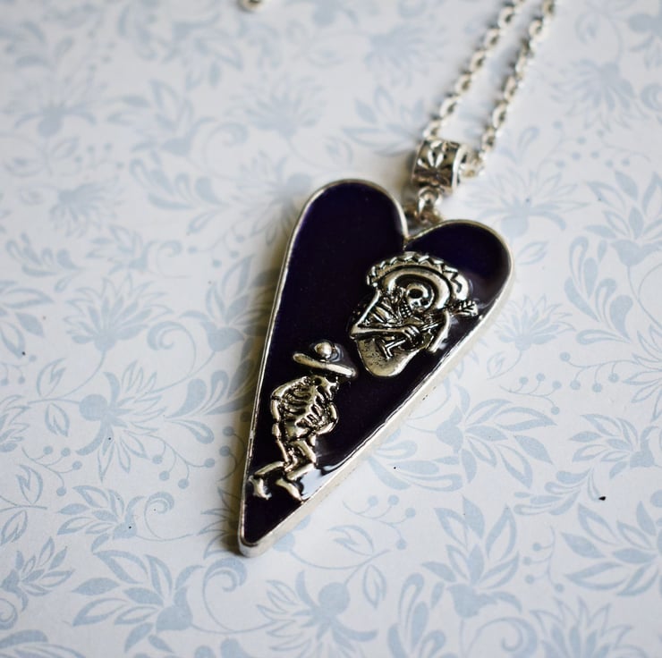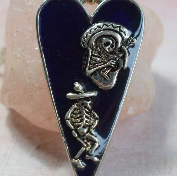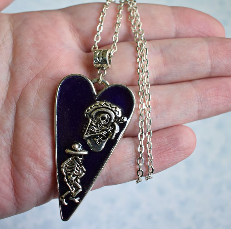 I have used a silverplated elongated heart pendant and filled it with deepest purple resin as a background for a dancing skeleton and his friend who is playing a guitar. The whole thing was then given another coat of clear resin to help keep it glossy and shiny.