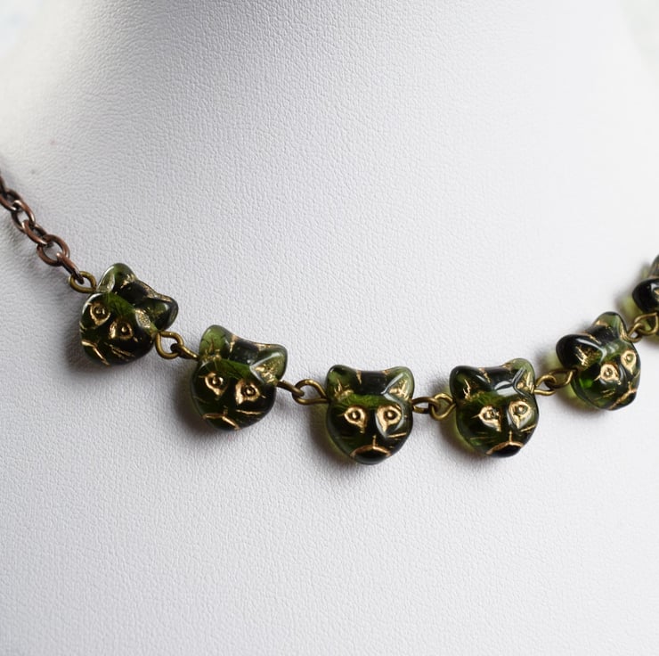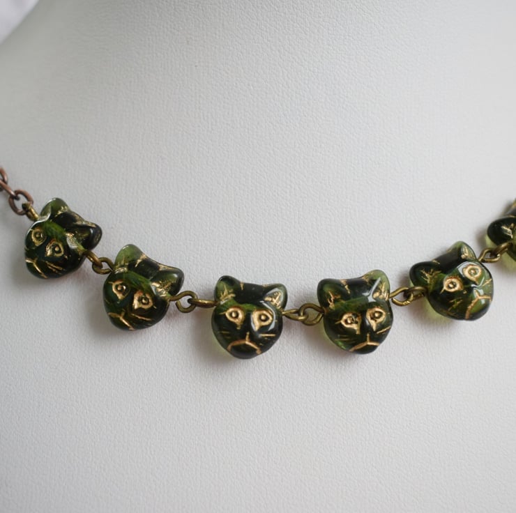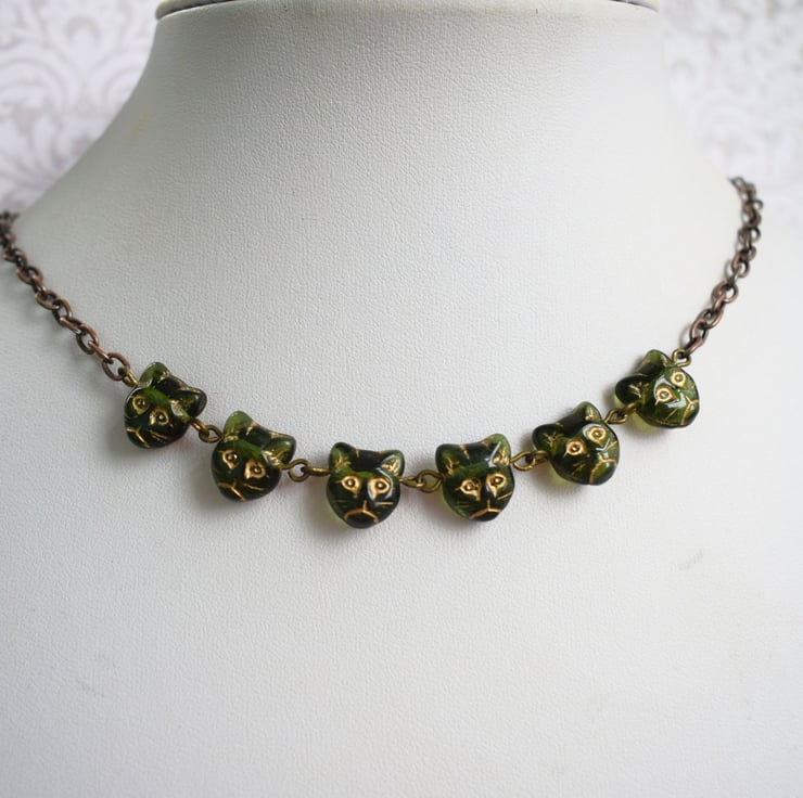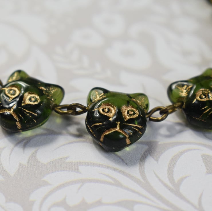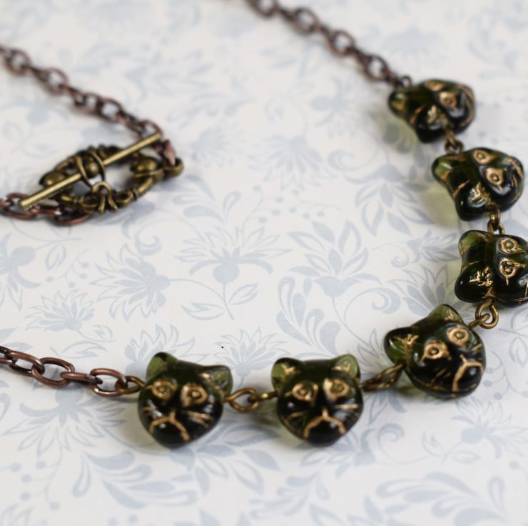 I have used some beautiful Czech pressed glass cat beads in a deep olive green for this one and paired them with some red copper plated chain as the colours mix so well. It fastens with a toggle clasp so is great if you find trigger and lobster clasps a little tricky.