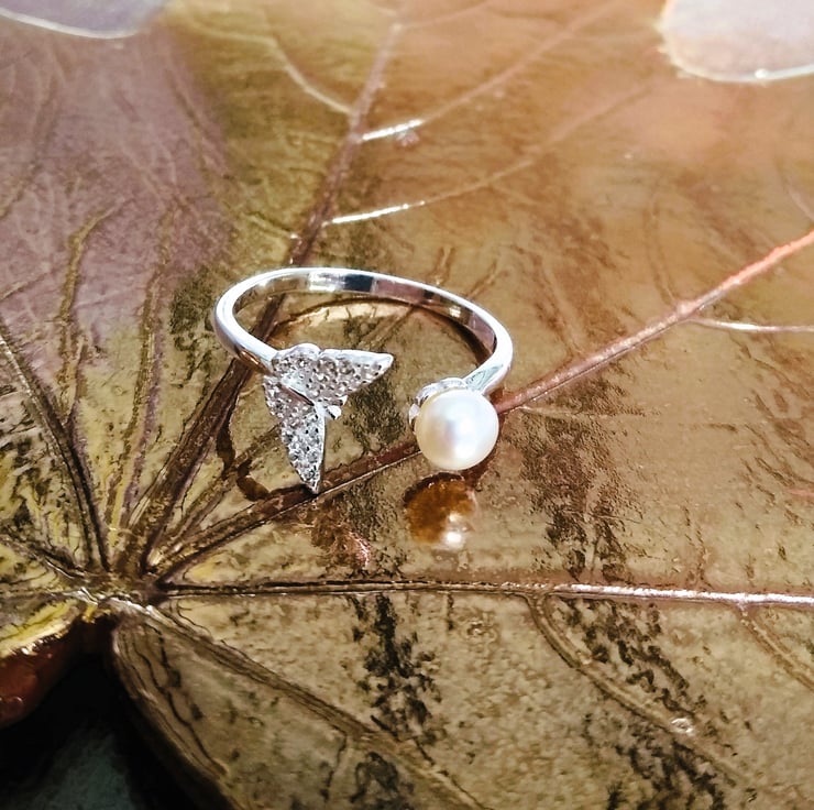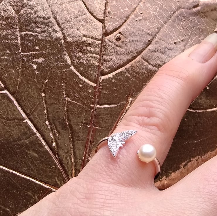 Sparkle in the light with this eye catching 925 Sterling Silver butterfly ring with a 5mm approx Freshwater Cultured Pearl & 20 x bezel set natural white Zircon gemstones approx 1mm.