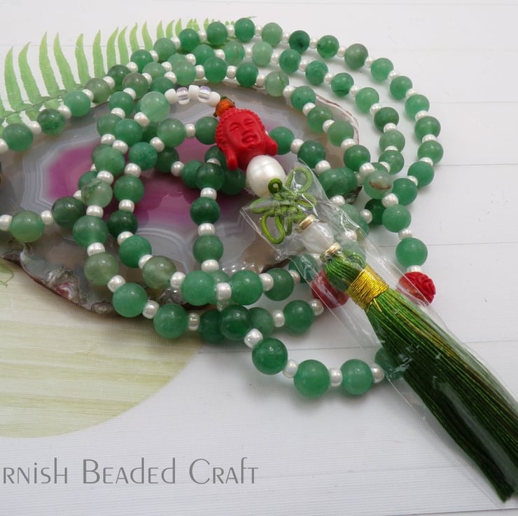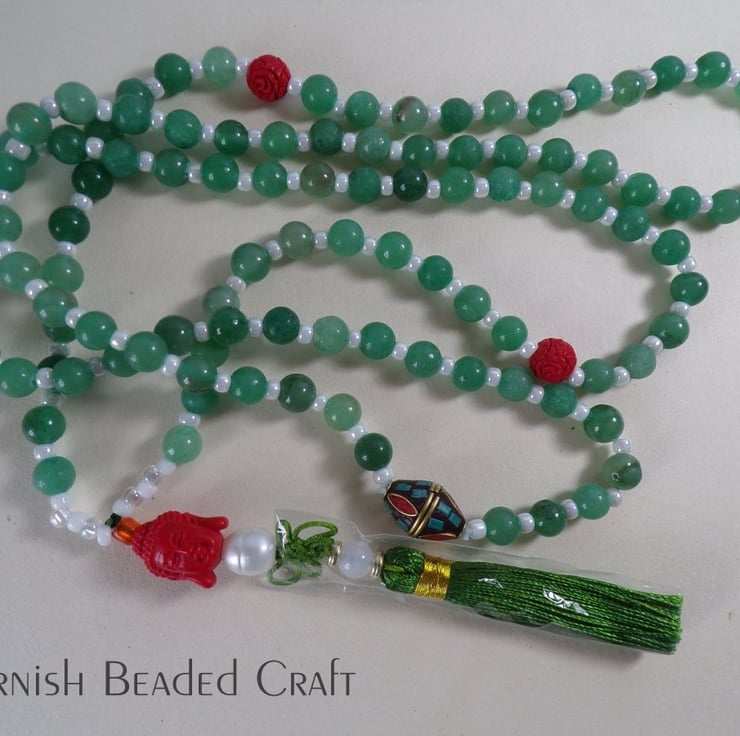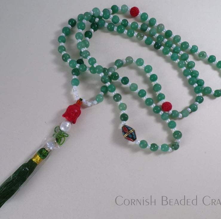 This is a Handmade Stunning 108 Beads Mala Necklace with Tassel, Natural Green Aventurine Beads