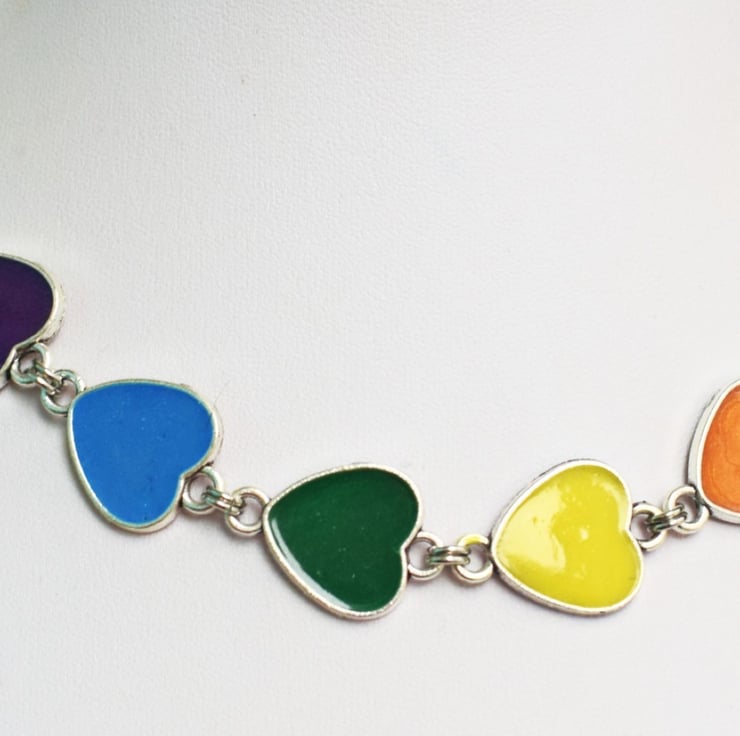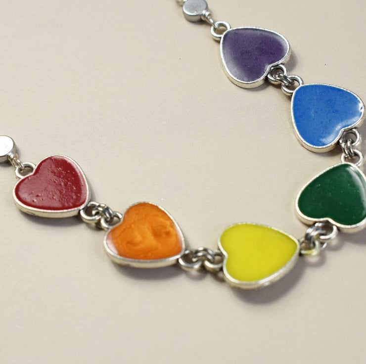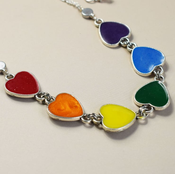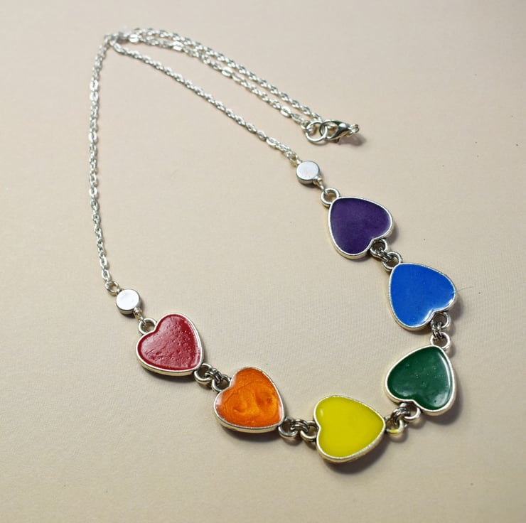 I've used silverplated hearts and filled them with rainbow shades of resin, they are linked together and then the necklace is finished with silverplated chain and a lobster claw clasp. Choose the length you would like your necklace from the drop down menu and get ready to add some rainbow joy to your life!