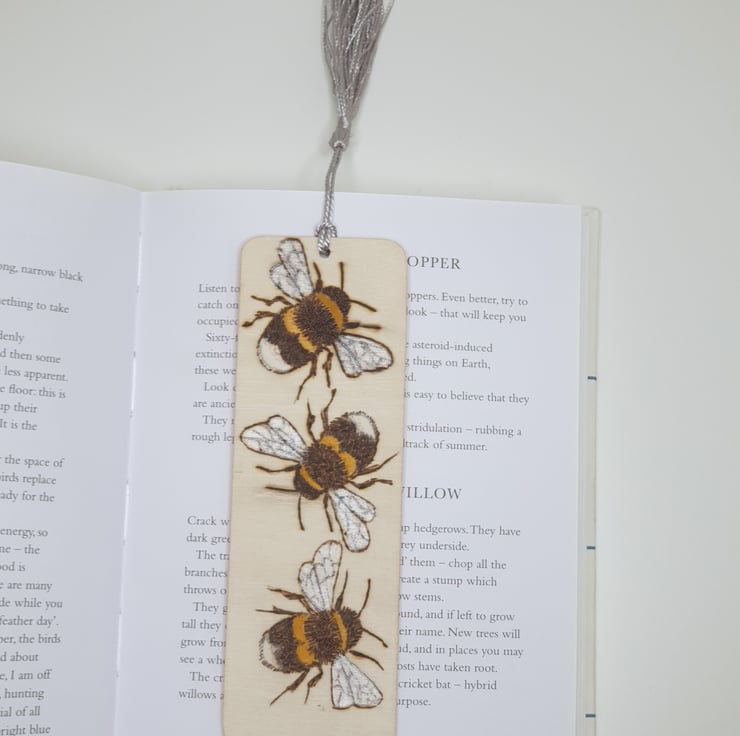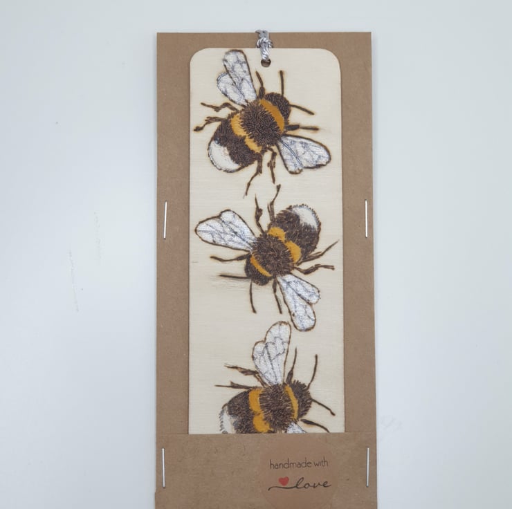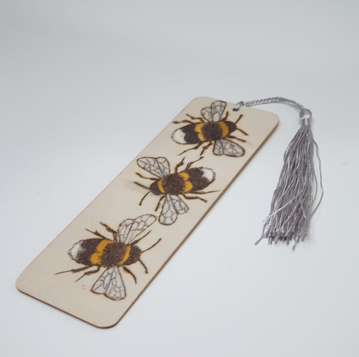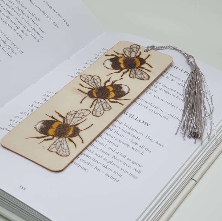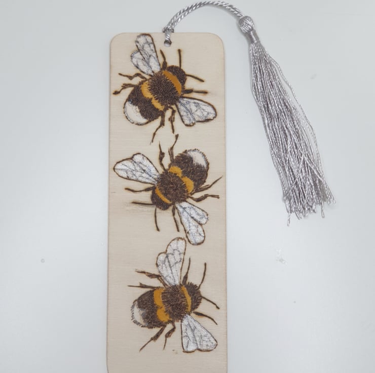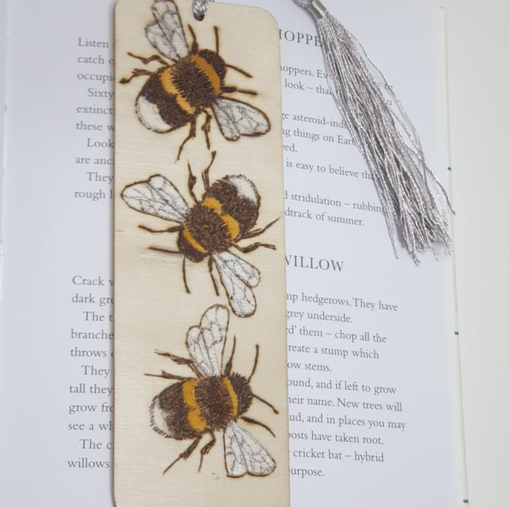 Three beautiful bees have been lovingly handburnt onto this wooden bookmark using pyrography and decorated with acrylic washes and the wings have a shimmer having been painted with a white metallic wash. This tactile bookmark has been finished with a silver coloured tassle and would make a lovely gift for a bee or nature lover.