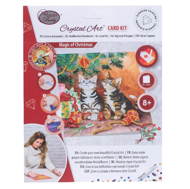 Crystal card kits are craft kits, ideal for children and adults, they enable you to make your own sparkly crystal card. This technique is similar to painting by numbers. Each crystal card design has a numbered, adhesive template. Using a tool (included), simply lift up the coloured crystals and place them on the corresponding numbered dots. They stick instantly! The result is a beautiful piece of sparkly art which you can gift to loved ones or use yourself. Making a crystal card takes 30-45 minutes. They are suitable for ages 6 and up.
