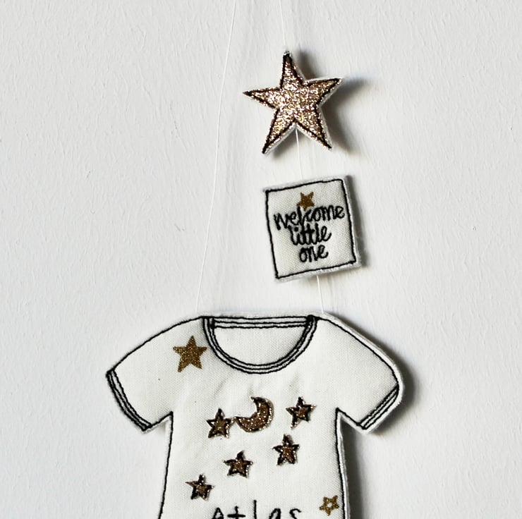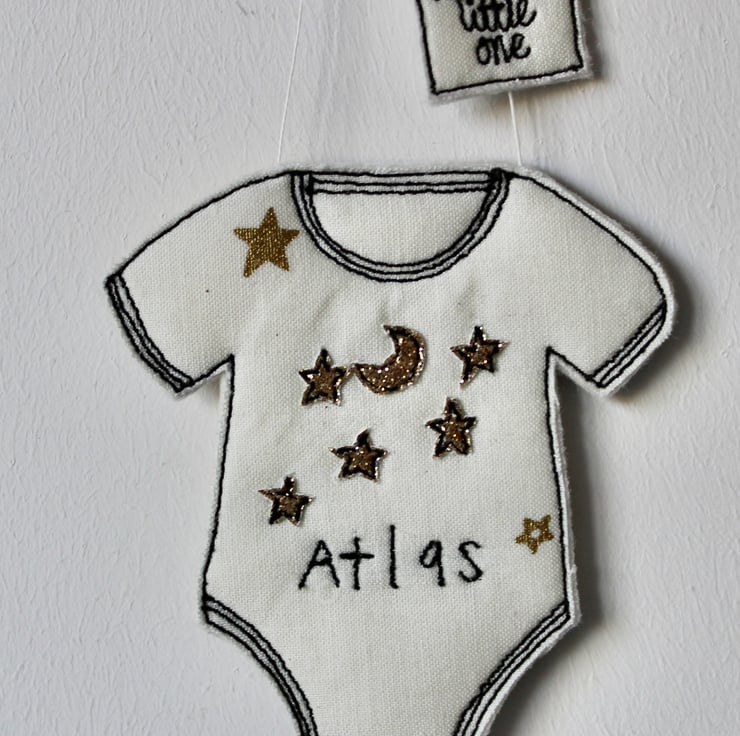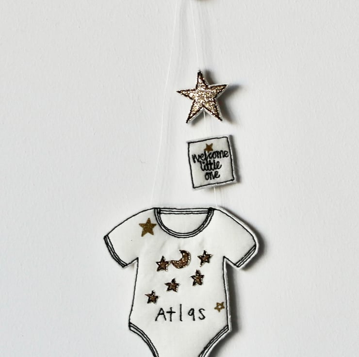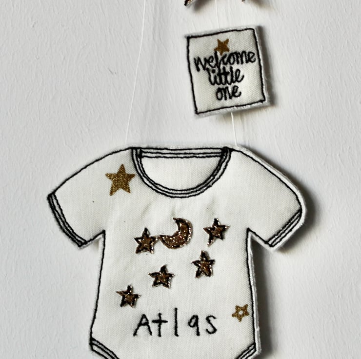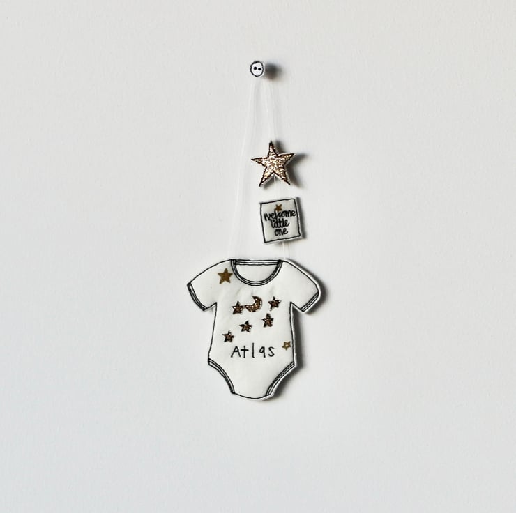 A 'Welcome Little One' baby-grow personalised with 'Atlas'.