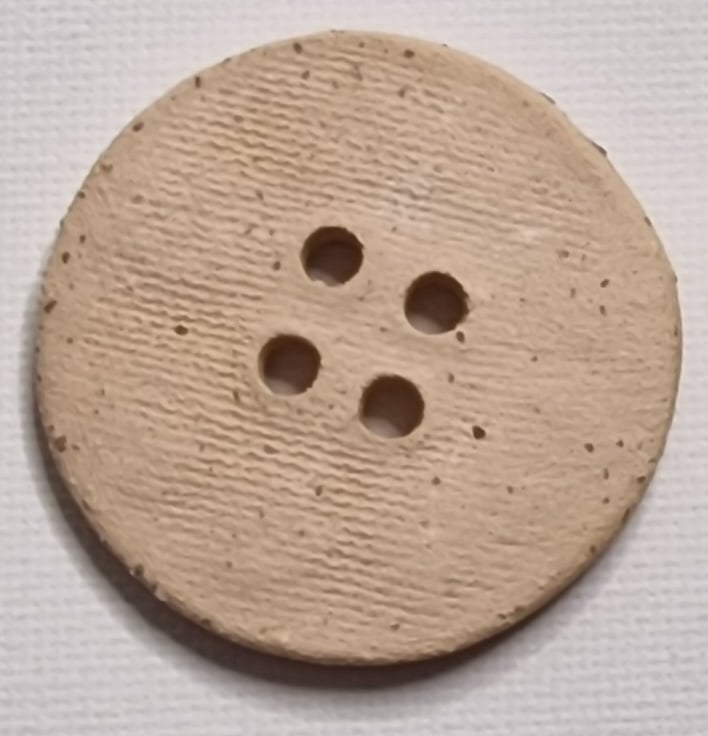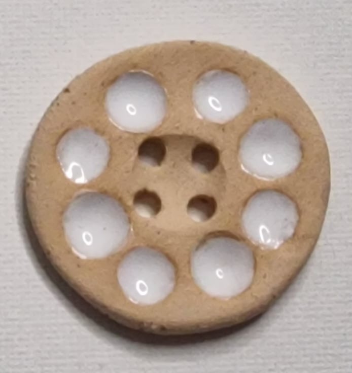 This button have been formed from clay and fired in the kiln, then glazed and fired a second time.