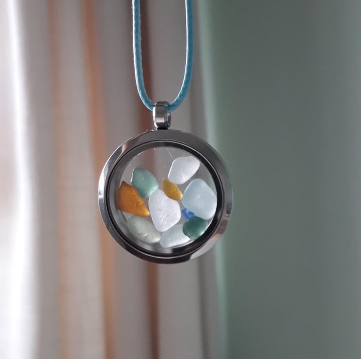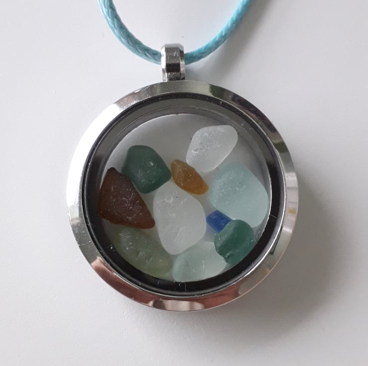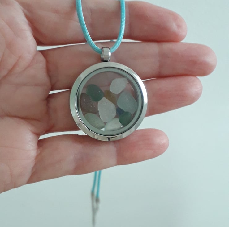 Carry the sea close to your heart with this pretty floating locket. It is made from quality stainless steel and glass and comes with 10 colourful small pieces of Seaham Sea Glass which I hand picked from the beach. It measures 1 inch in diameter and has a blue waxed cotton cord (18 inches with a 2 inch extension).