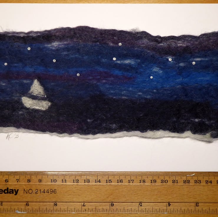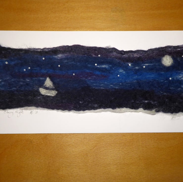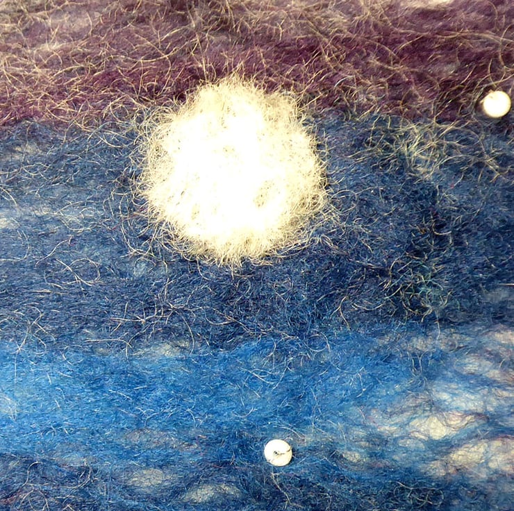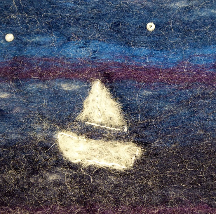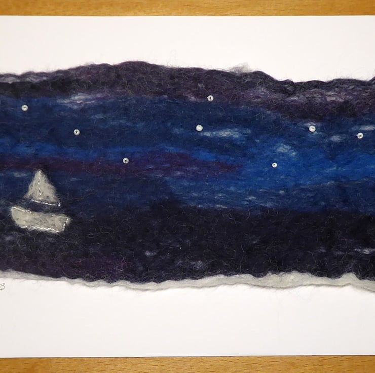 The background is wet felted. It is a process that involves laying down multiple layers of raw un-spun merino wool, which is then moistened and repeatedly rolled until all the wool fibres mesh or 'felt' together. I don’t completely felt the wool so that individual fibres are still visible and add texture to the image. Once dry I added the boat and moon using the needle felting technique and hand attached the beads for stars.