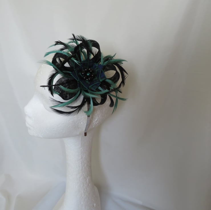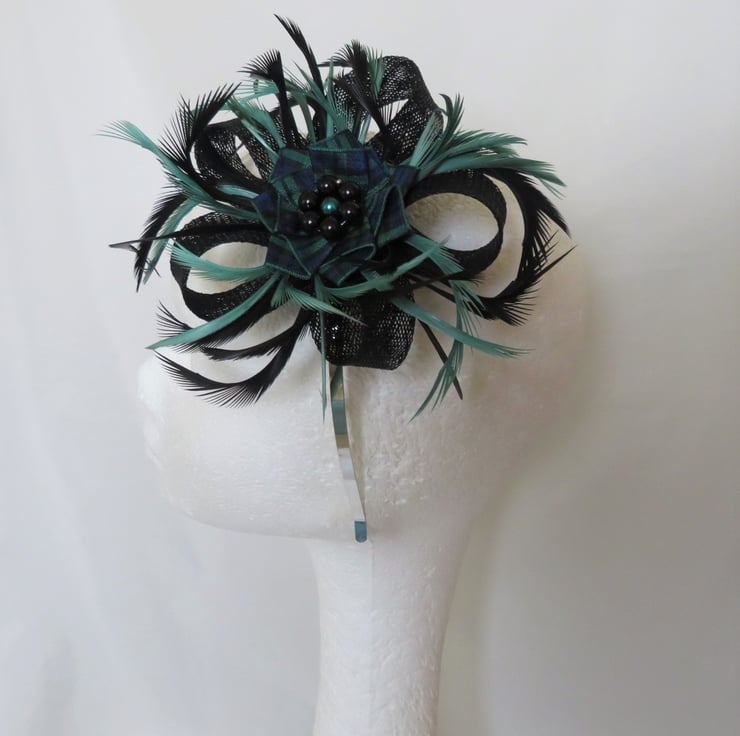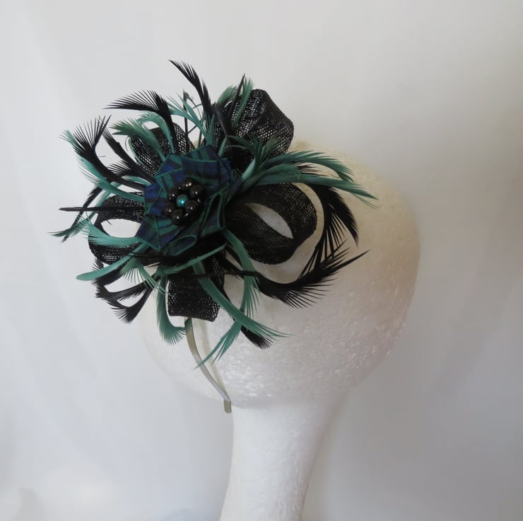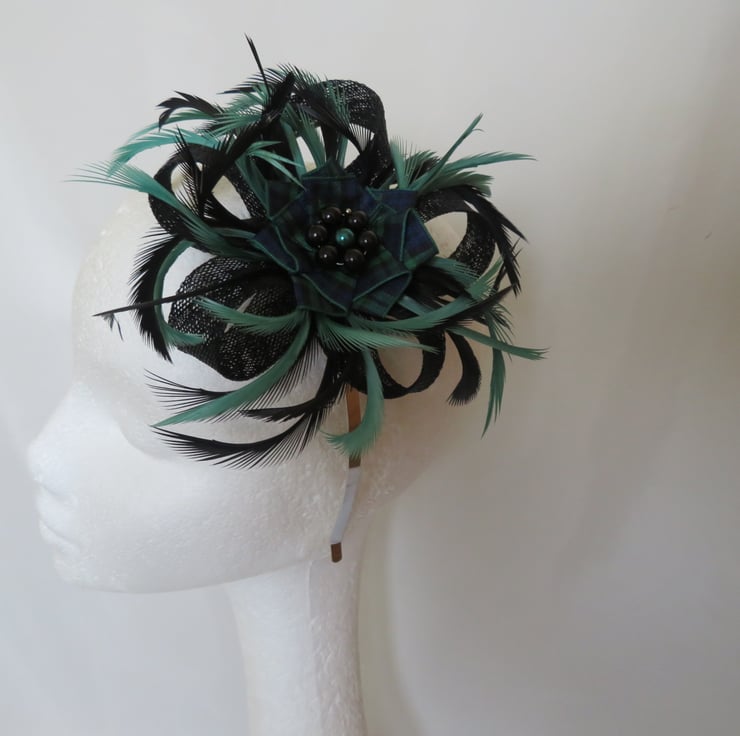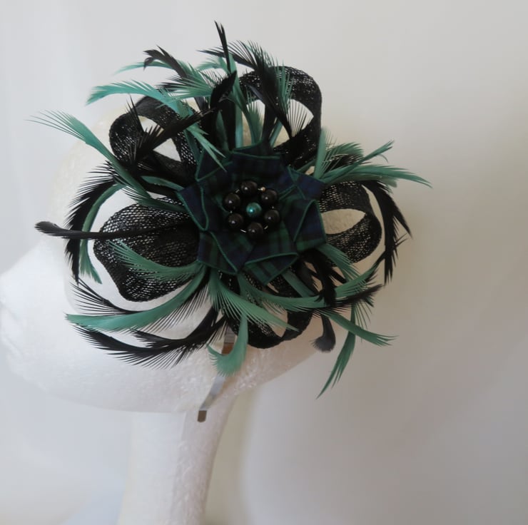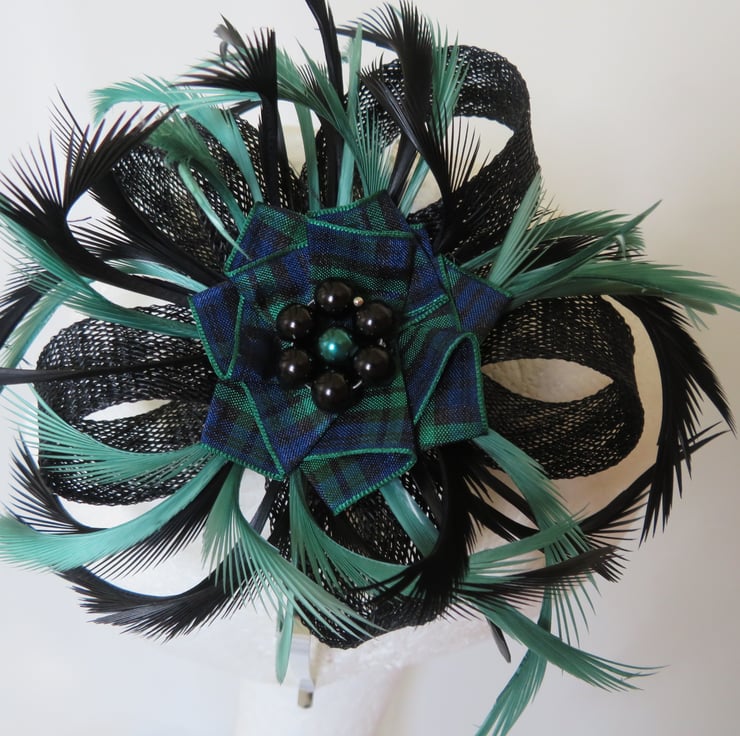 Complemented with black and light bottle green/ dusky emerald biot feathers and finished with a Black Watch tartan ribbon ruffle, and a cluster of black pearls and a dark bottle green one in the centre.