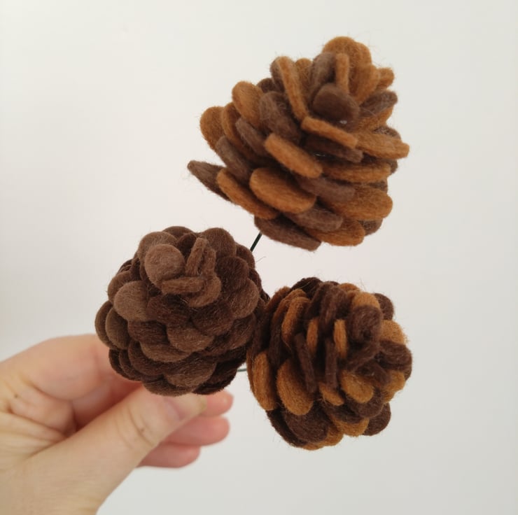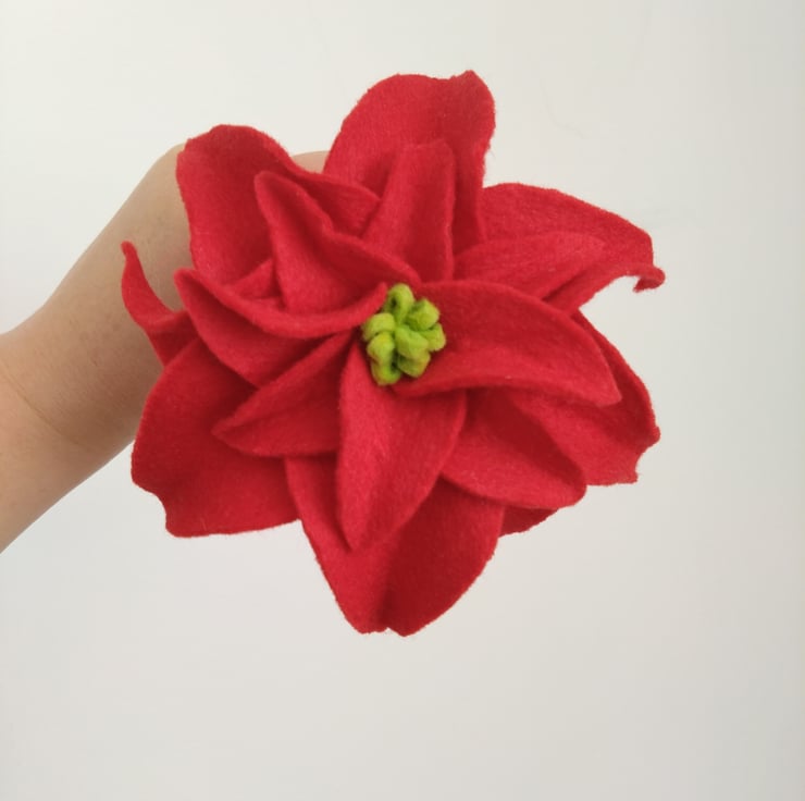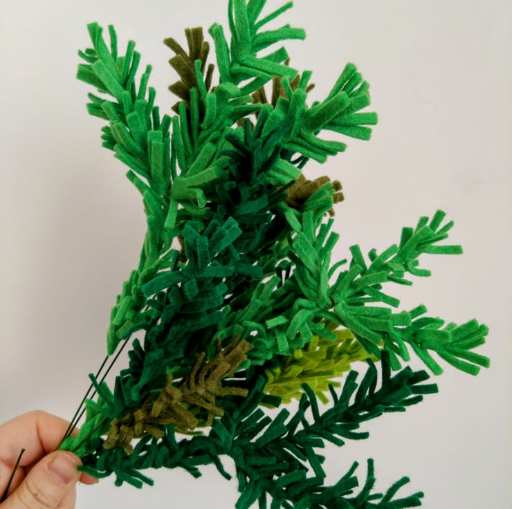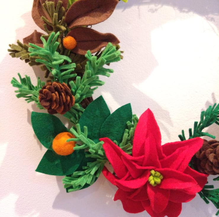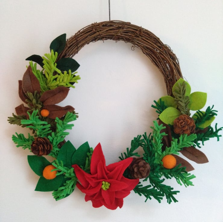Green felt 'foliage' attached to grapevine wreath base and completed with poinsettia flowers and pinecones.