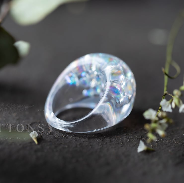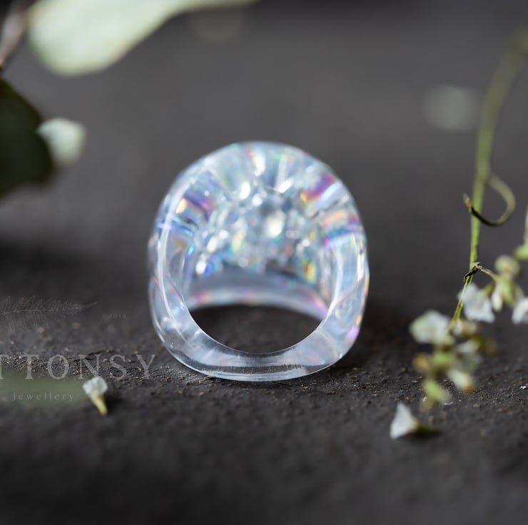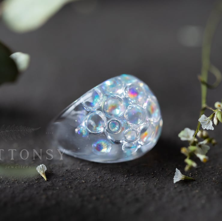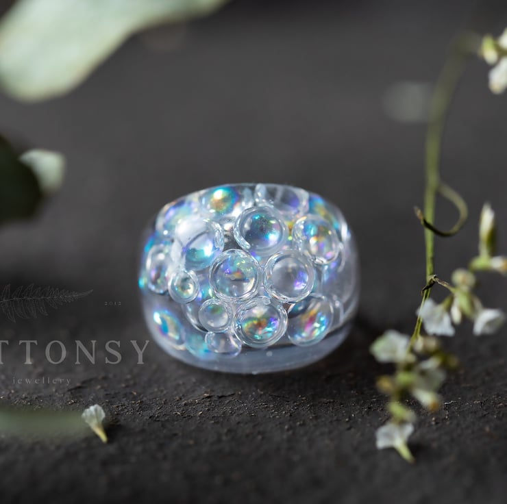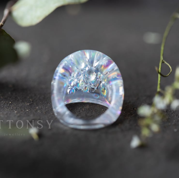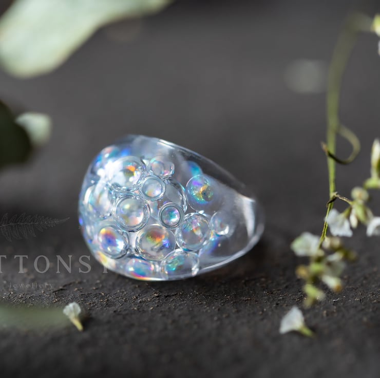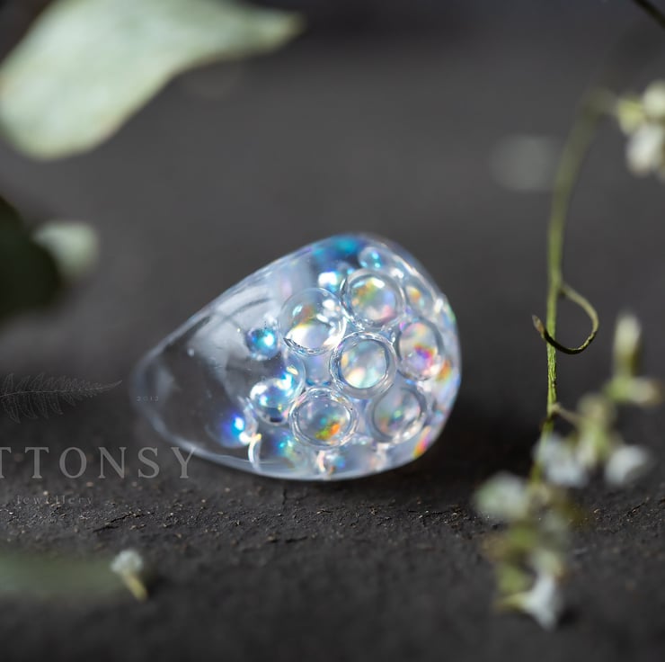 You are looking at a magical statement cocktail ring, filled to the brim with gorgeous bubbles. The bubbles are colour-shifting as they catch the light - almost exactly like real bubbles - so there are tiny rainbows that flash and sparkle as you move your hand 3