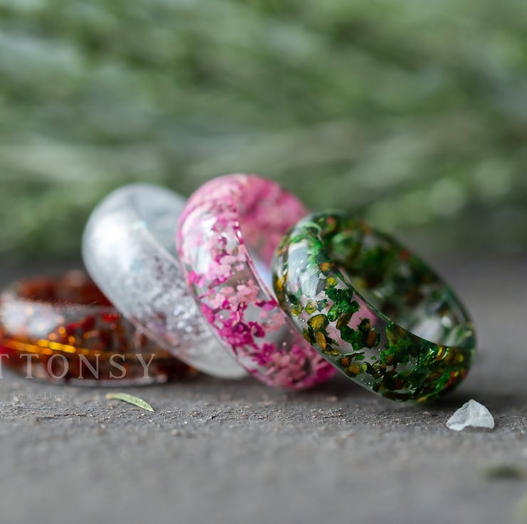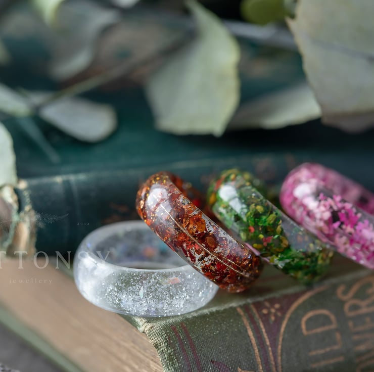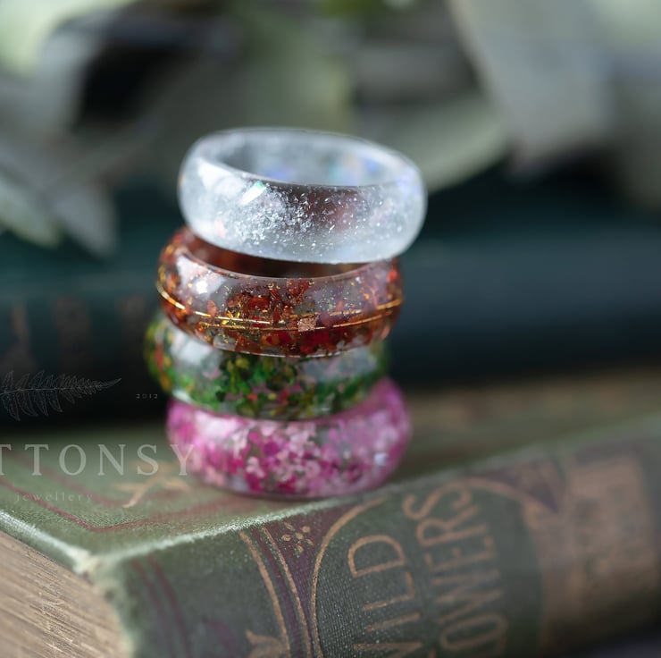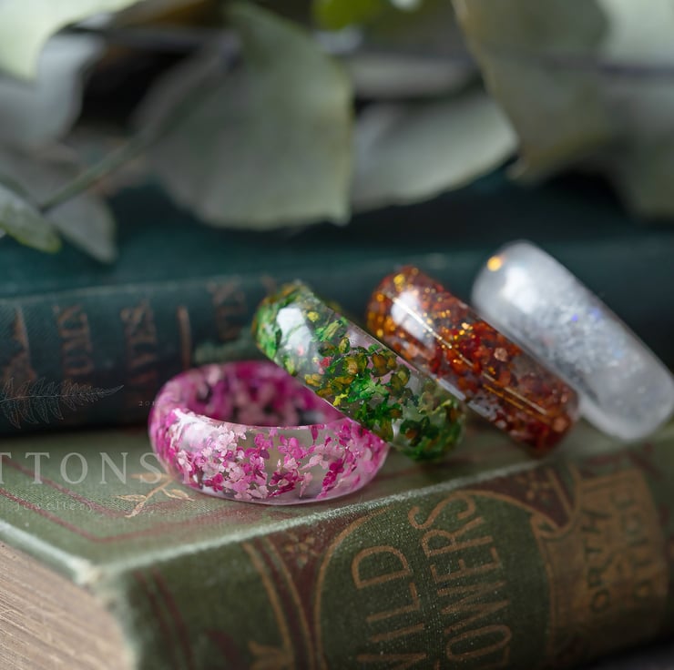 These beautiful rings are a Buttonsy signature design - depicting each of the four seasons. Spring has cascades of pink blossom; Summer has leaves and greenery and a riot of summer flowers; Autumn's russet leaves are tumbling down, ready to be kicked through, and the leaves are intertwined with genuine 24ct gold Japanese kinshi thread; Winter is beautiful as the perfect glittery white snow gently showers down, and iridescent sparks shimmer around the band...