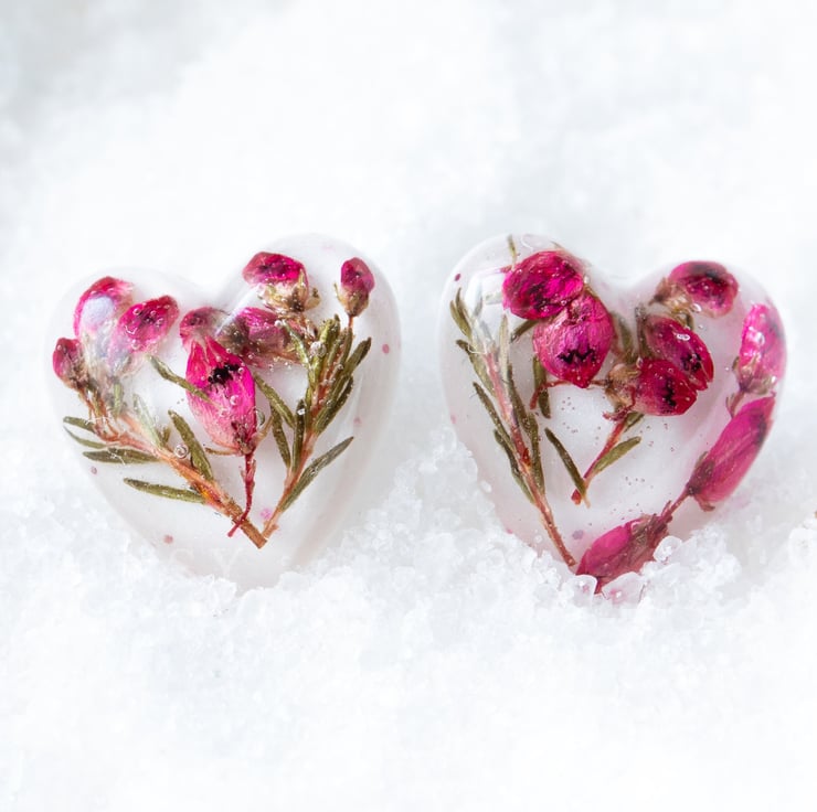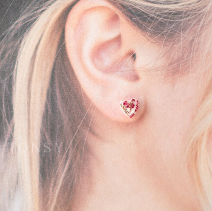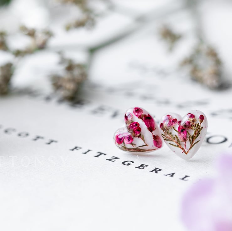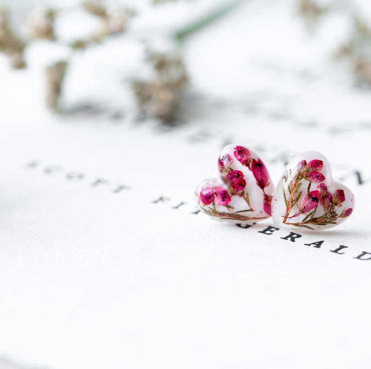 These teeny, tiny beautiful real flower earrings are filled with heather flowers and leaves. The gorgeous pinkyred of the petals is complemented by tiny glitters that catch the light as you move your head. Lovely! They are set against a white background to make sure the colours POP!