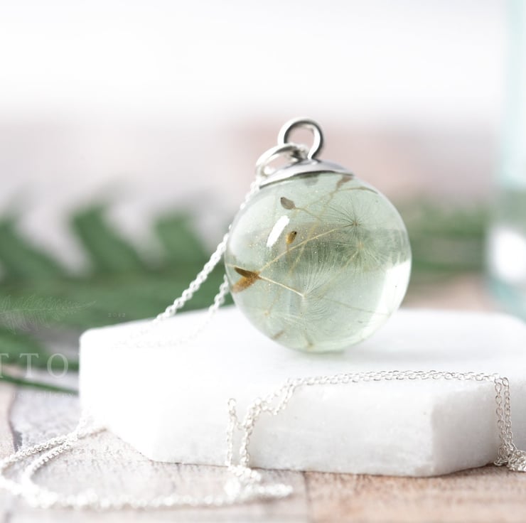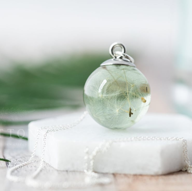 Beautiful dandelion wishes have been caught in perfect, palest sage green resin and a myriad tiny gold shimmers. This is truly magical jewellery. It is delicate, and whimsical, for women that live amongst the wildflowers and look for shapes in clouds.