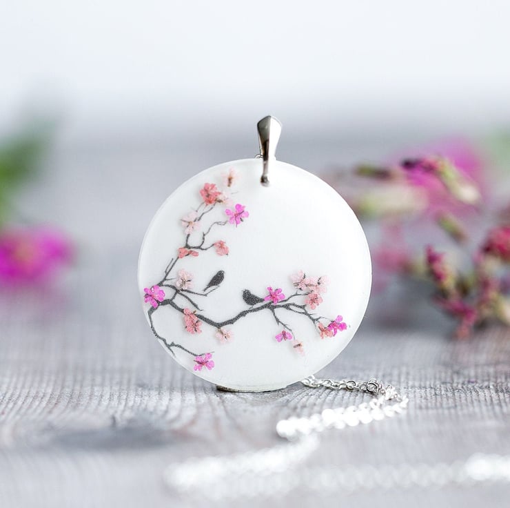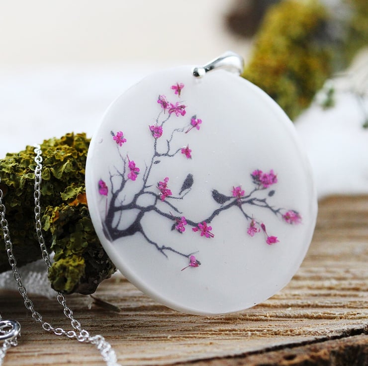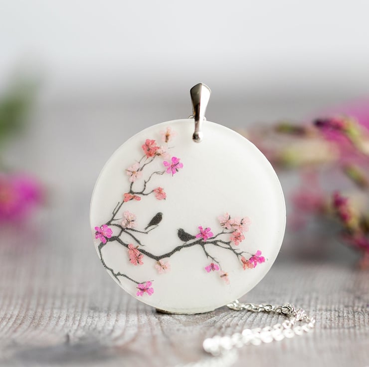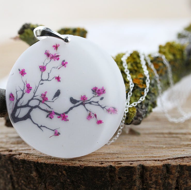 Real Flower Birds in a Blossom Tree Necklace Bird Necklace Botanical Jewelry Pre