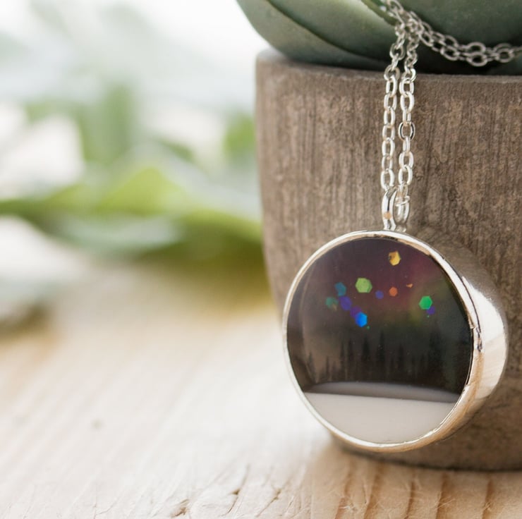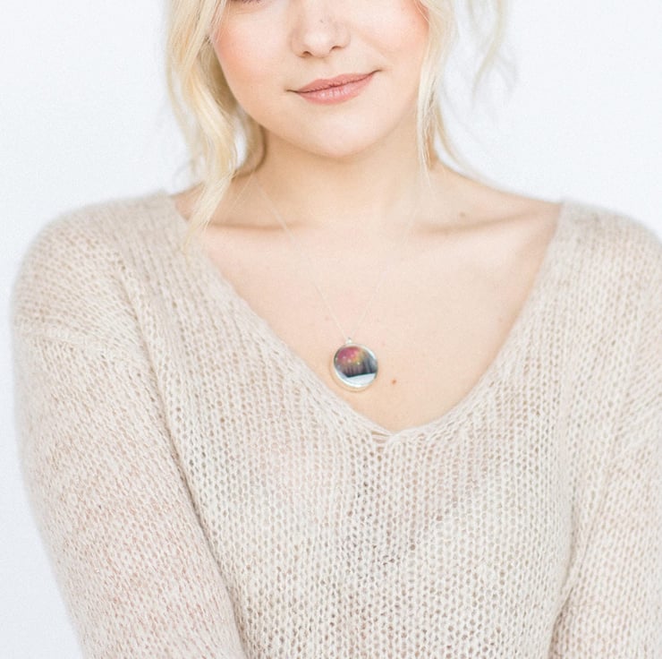 The pendant is 30mm across (the frame is silver-plated) and comes on an 18" sterling silver chain.