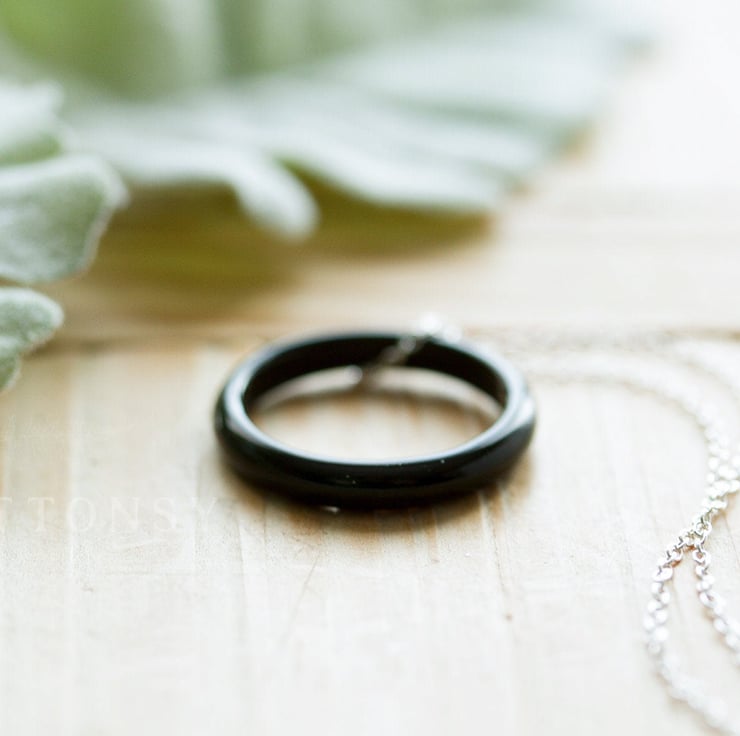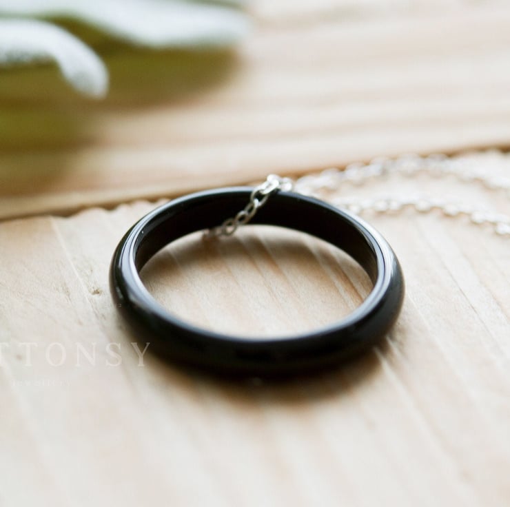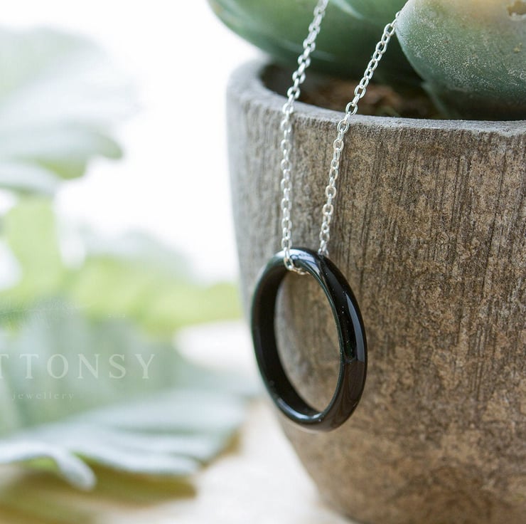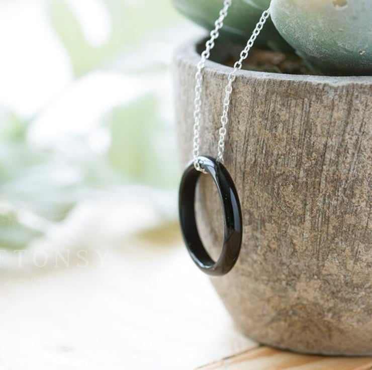 A gorgeous, minimalist ring necklace in a beautiful jet black. Each is slightly different, but your necklace will be equally delicate and elegant.