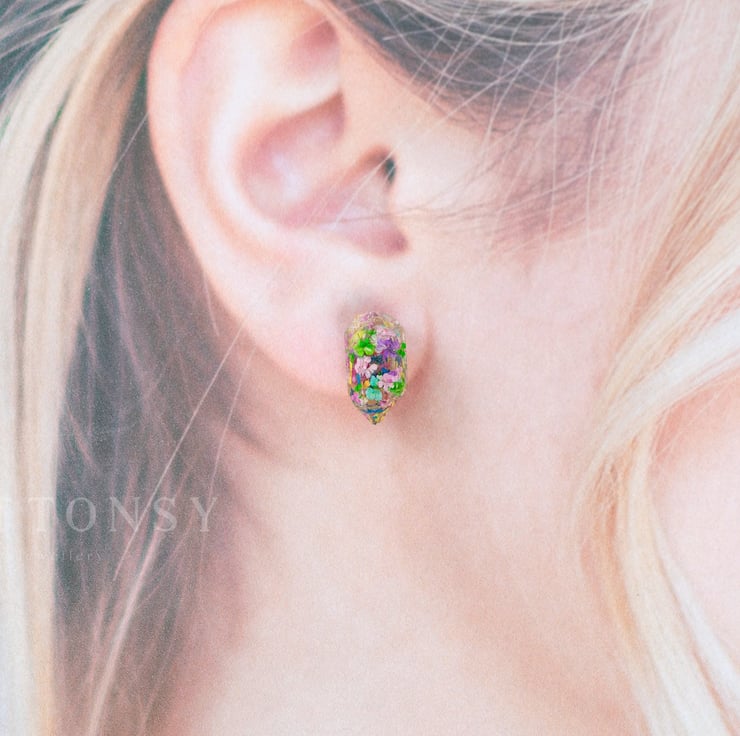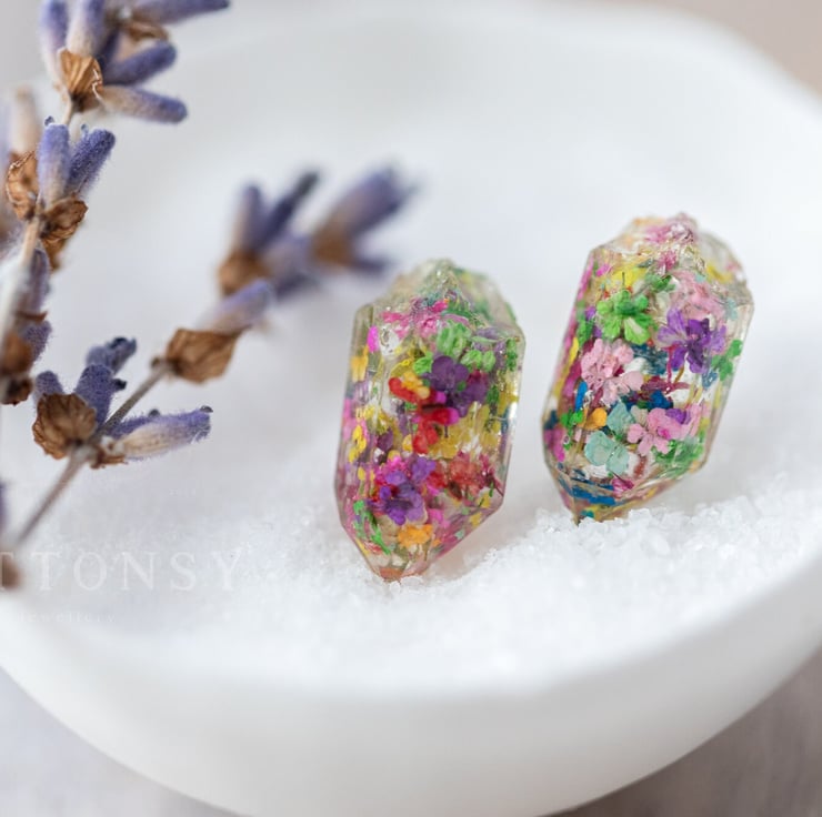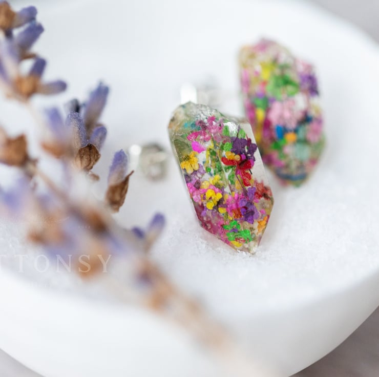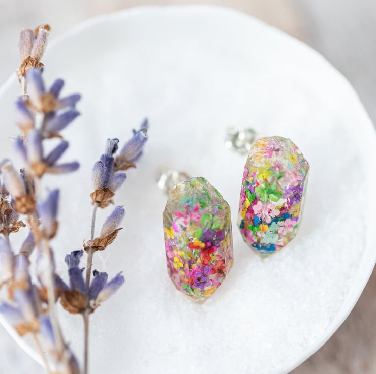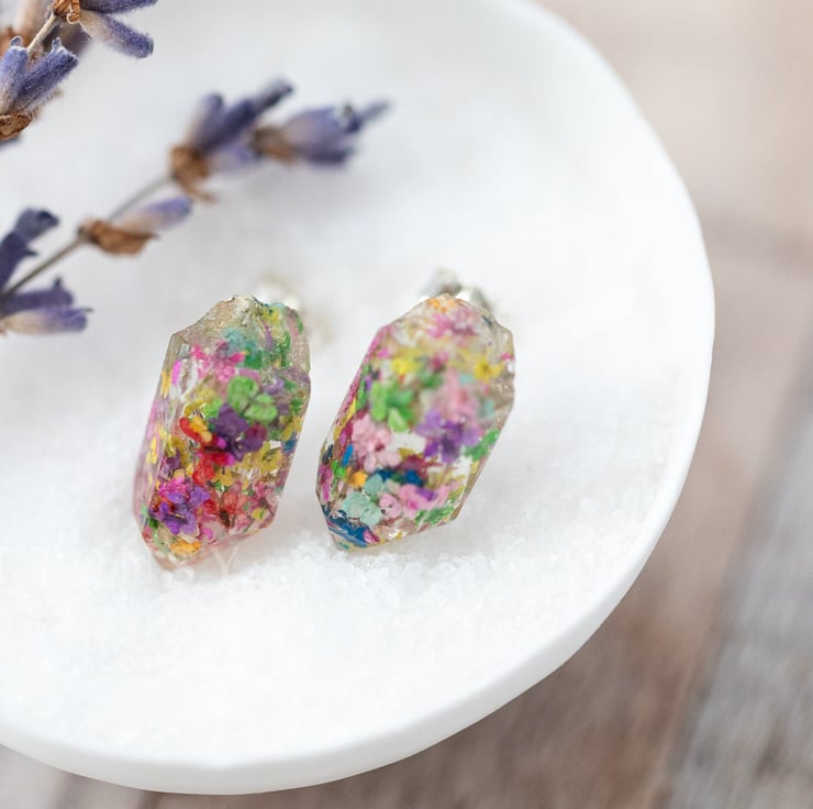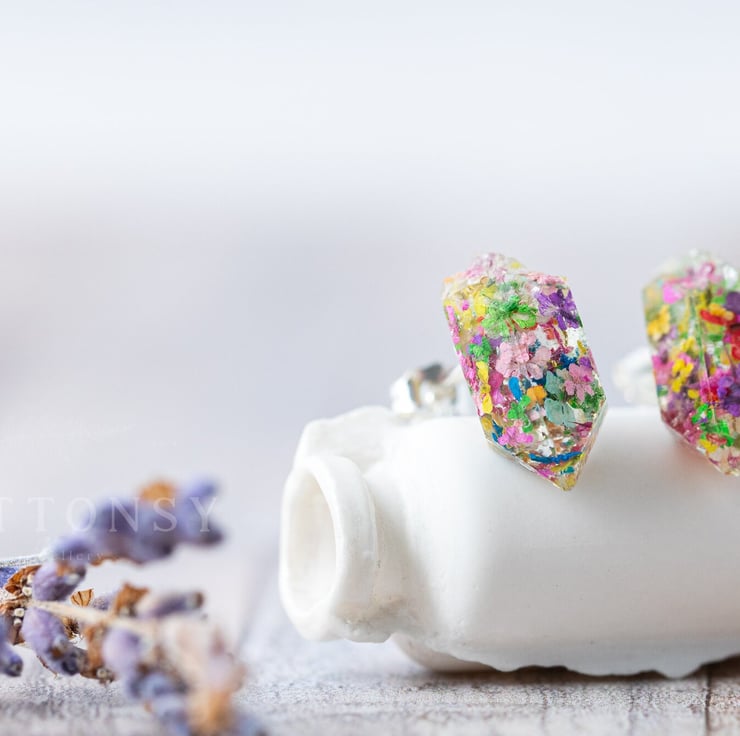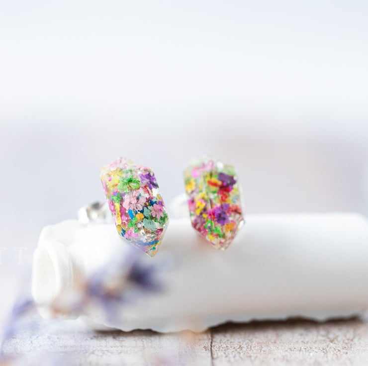 You are looking at a magical pair of real flower "raw crystal" earrings, filled with beautiful real flower rainbow confetti.
