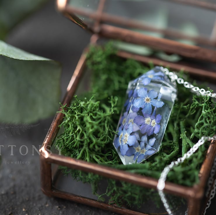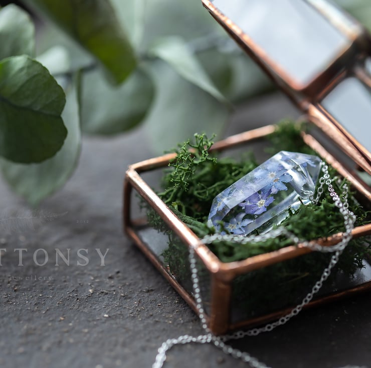 Forget Me Not Necklace "Raw Crystal" Pressed Flower Jewelry Birthday Gifts Somet