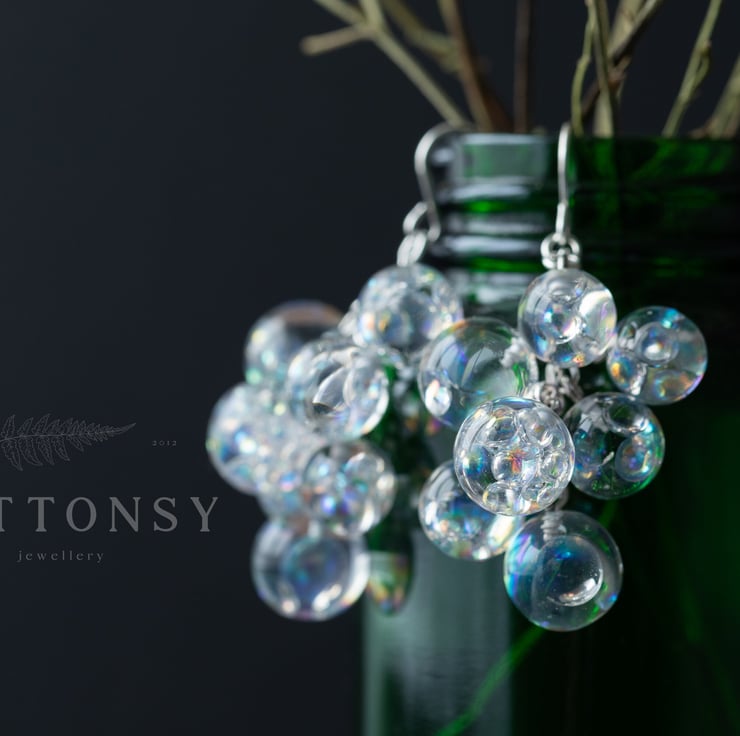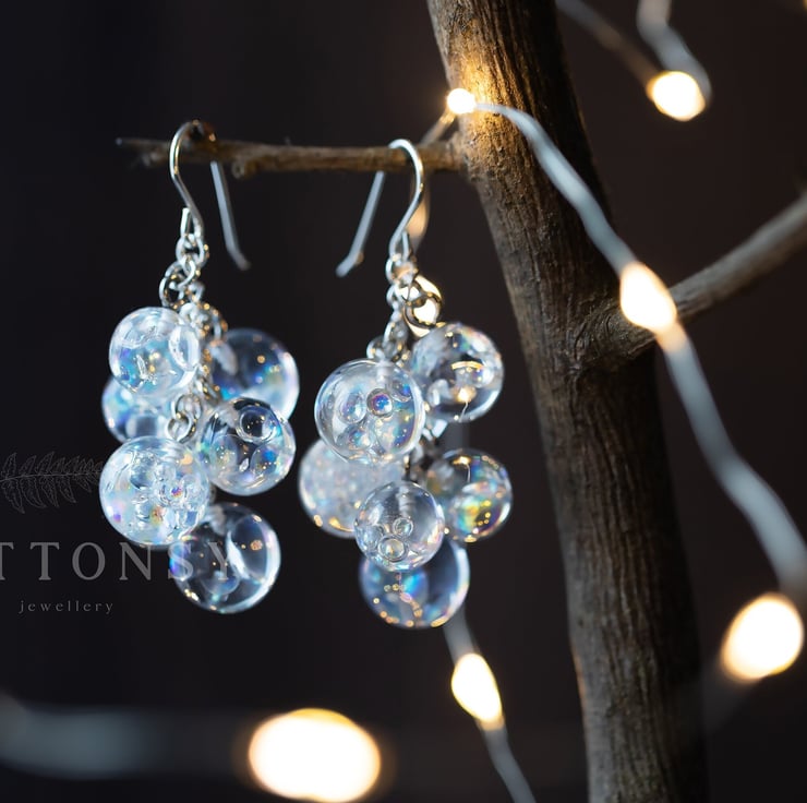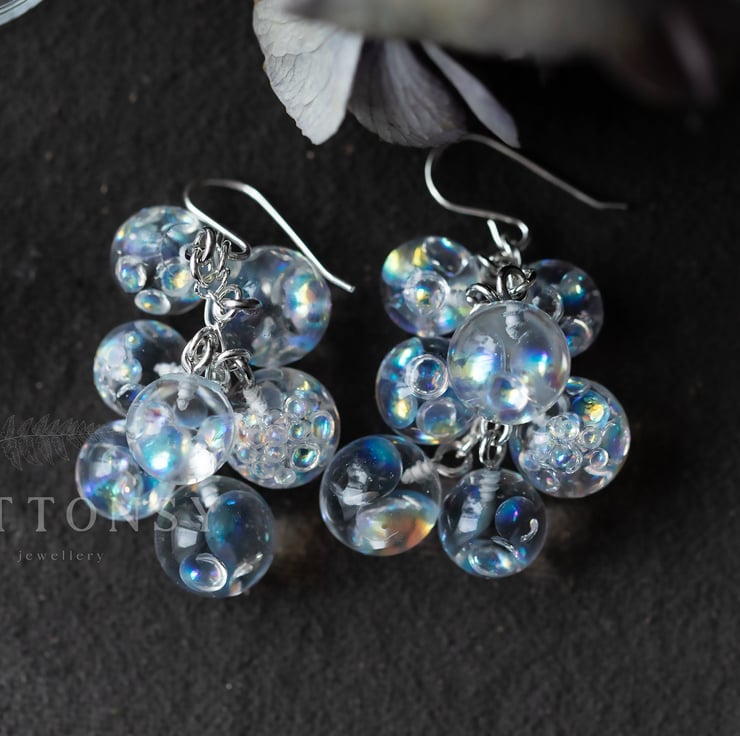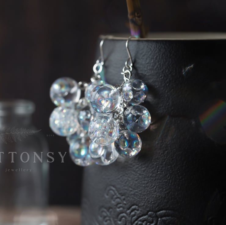 A stunning, stunning pair of bubble charm earrings, made of iridescent bubbles, in sterling silver.
