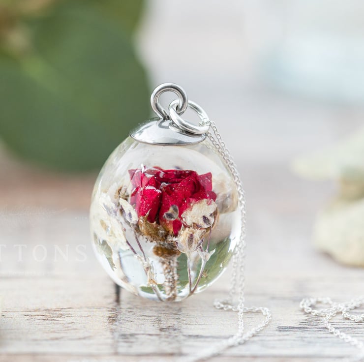 A stunning, romantic, whimsical necklace featuring a perfect single red rose, and sprigs of white baby's breath... it's like a beautiful bouquet condensed into a perfect piece of jewellery.