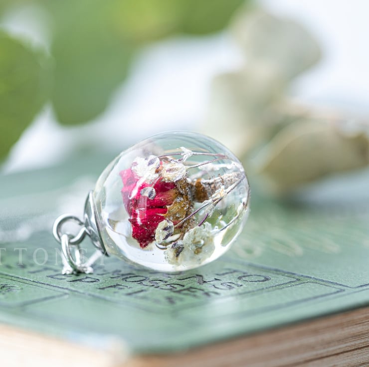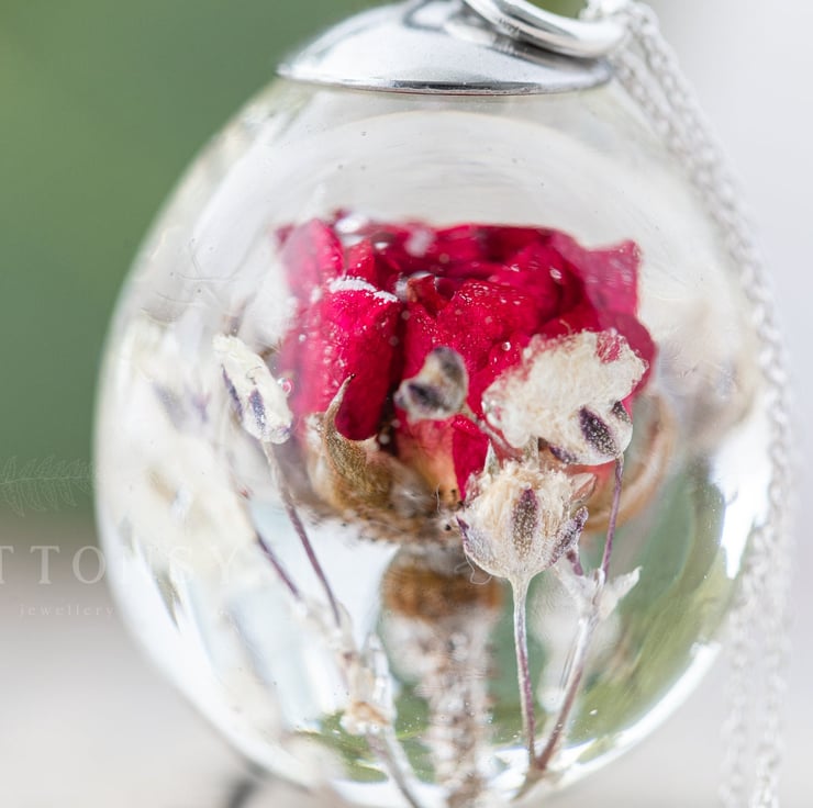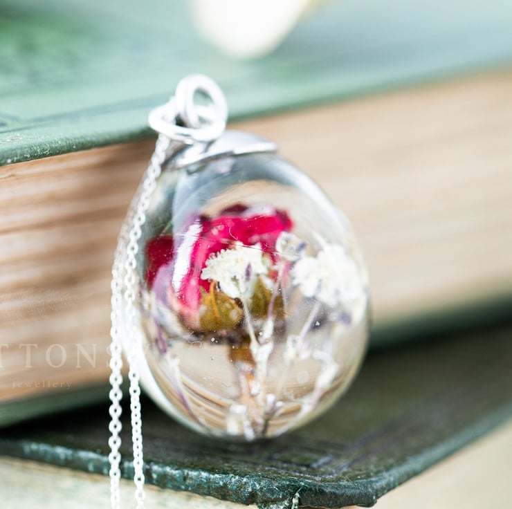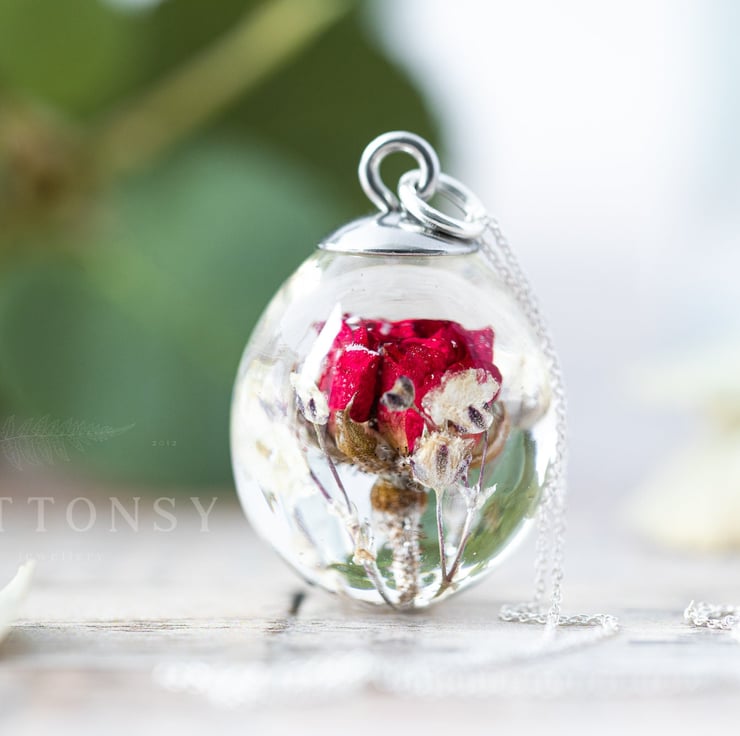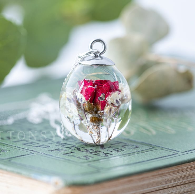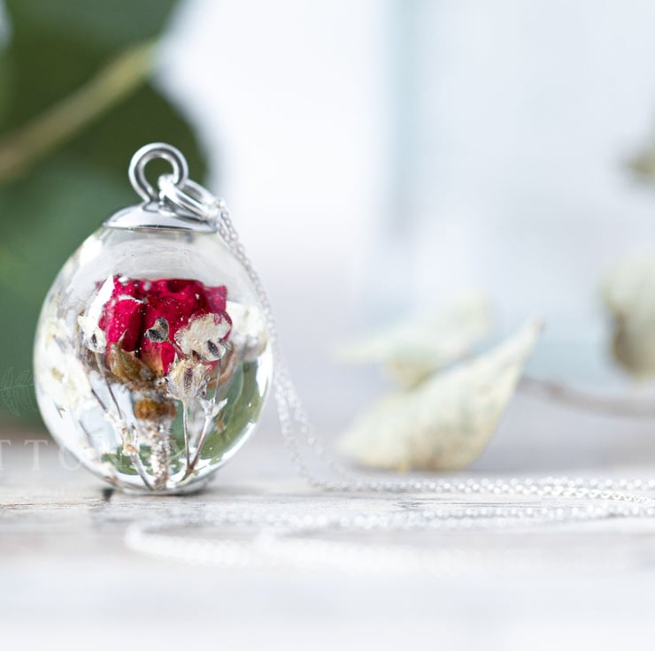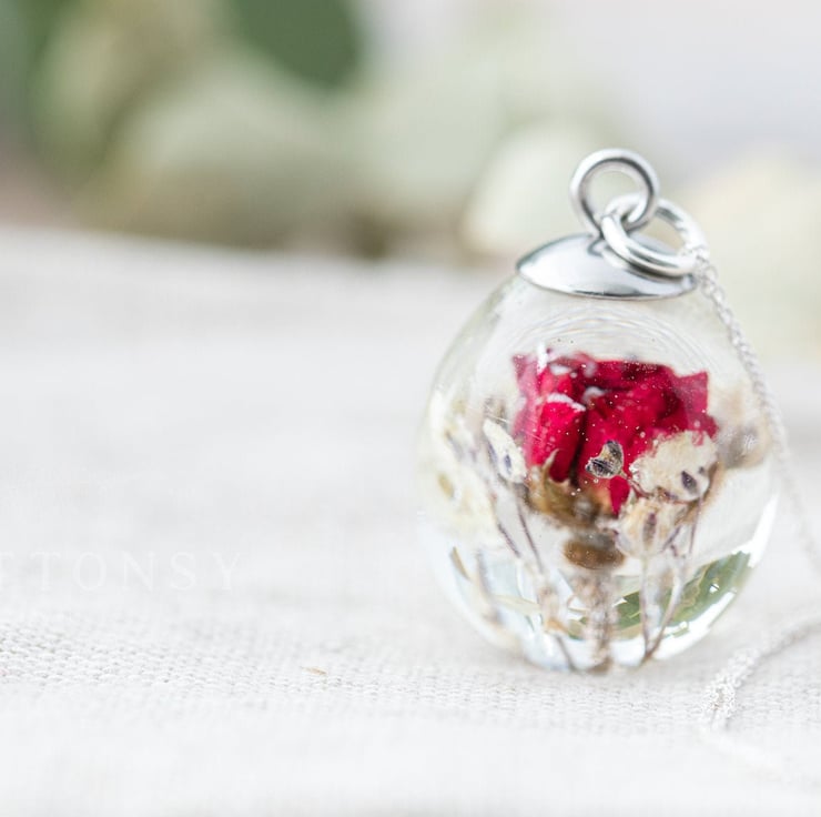 A stunning, romantic, whimsical necklace featuring a perfect single red rose, and sprigs of white baby's breath... it's like a beautiful bouquet condensed into a perfect piece of jewellery.