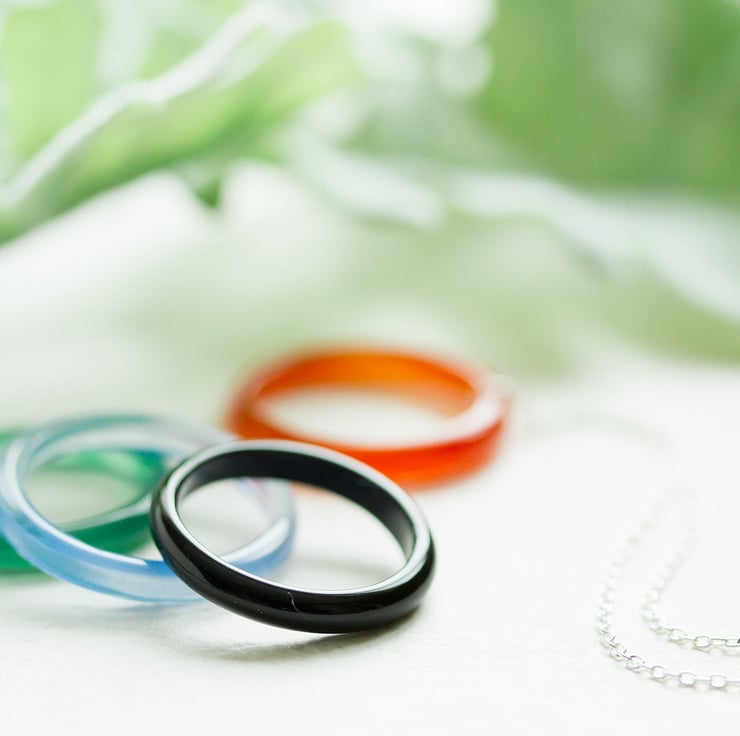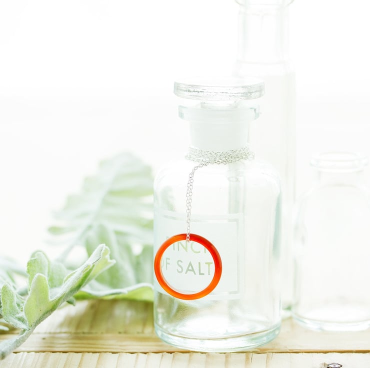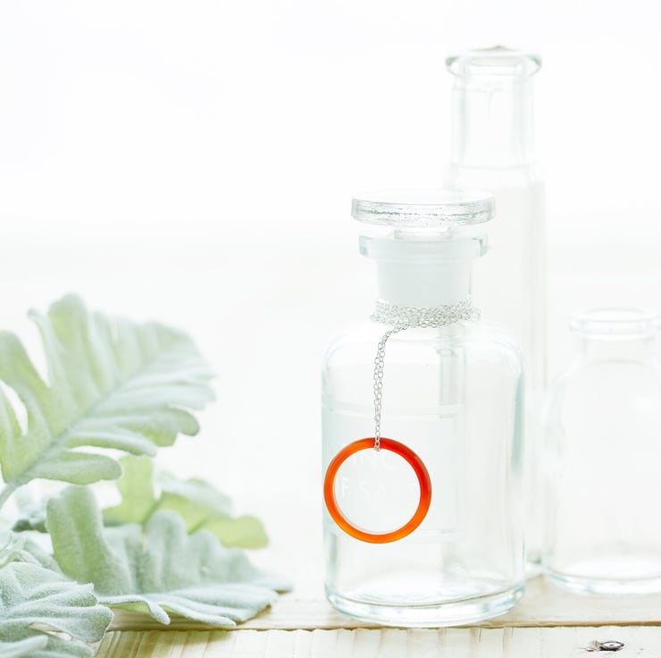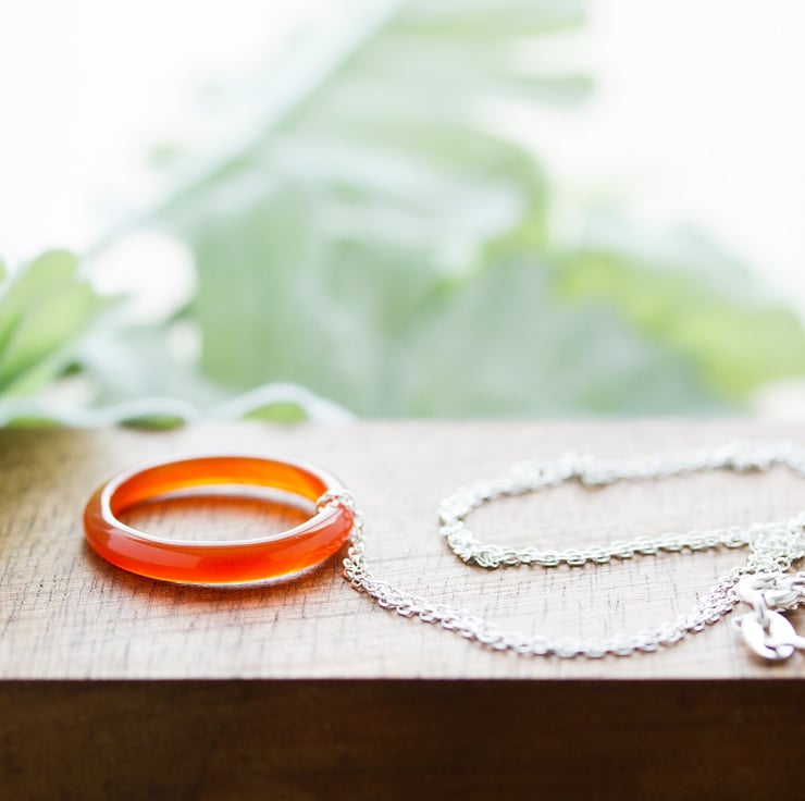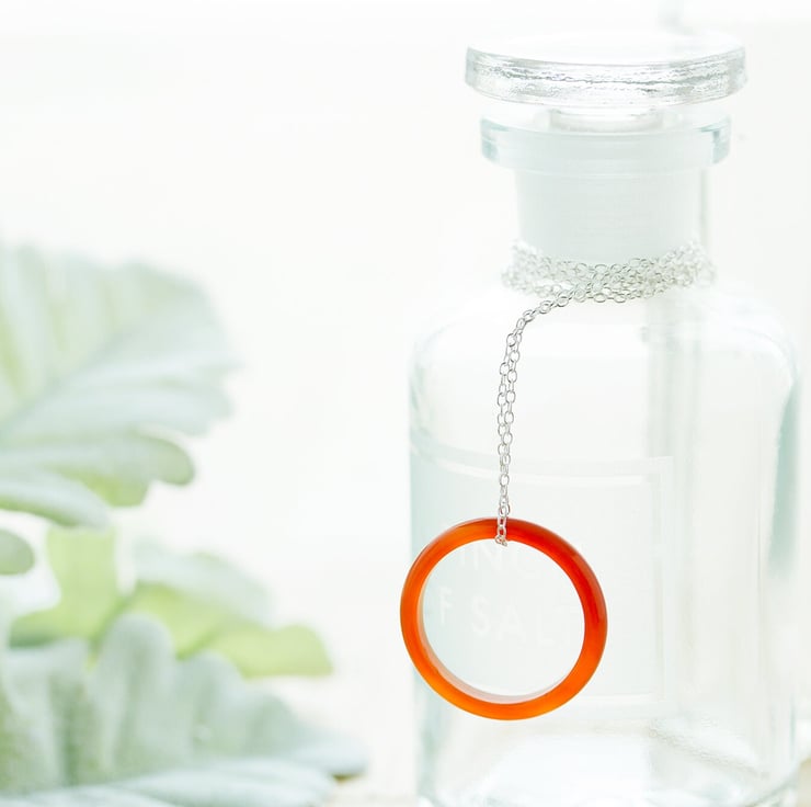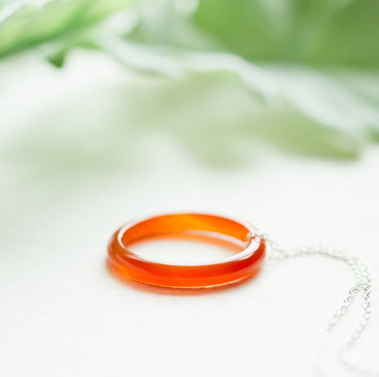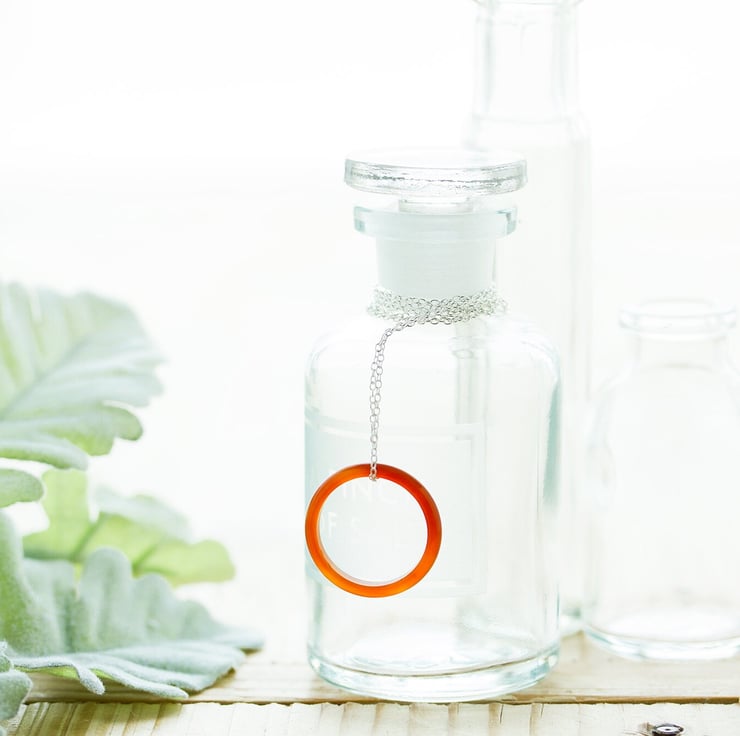 A gorgeous, minimalist ring necklace in a fiery orange. Each is slightly different, so yours will be in the fiery orange family, but won't necessarily be the same exact shade. So it'll be the same gorgeous colour, but not necessarily the same shade... it will, though, be equally delicate and elegant.