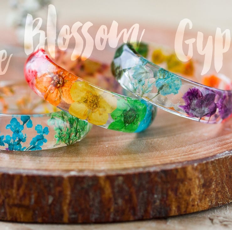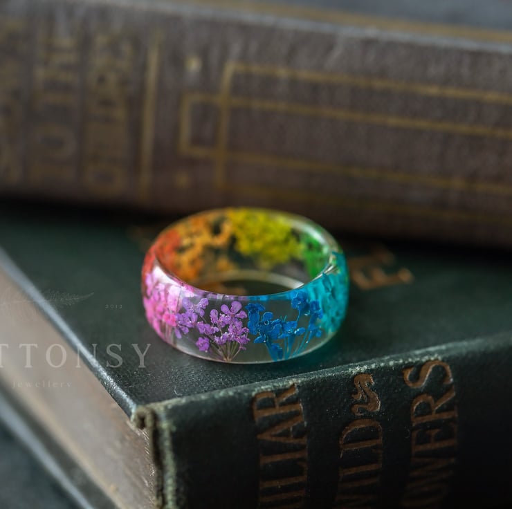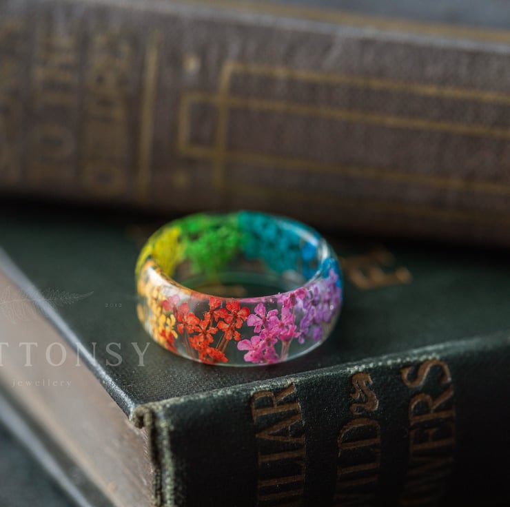 This beautiful ring is a Buttonsy signature... real flowers, in a rainbow of colours! They are about 5mm wide, so they look wonderful on their own, or as chunky stacking rings. Wear this ring and literally have summer in the palm of your hand... the last photo shows the 3 types of rainbow real flower ring we make: Queen Anne's Lace; blossom, and Gypsophila, all available in our shop.