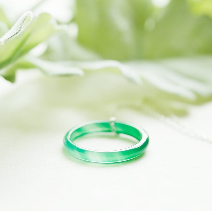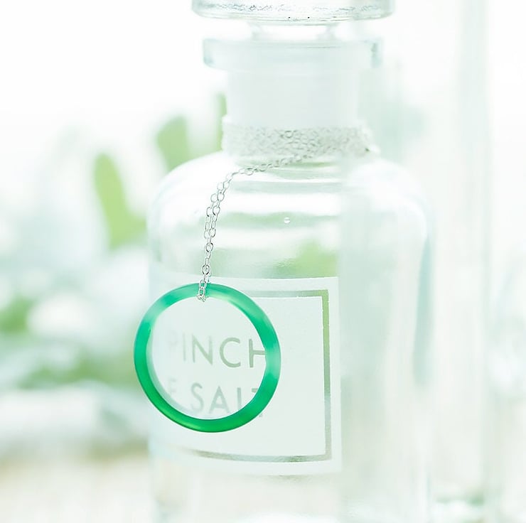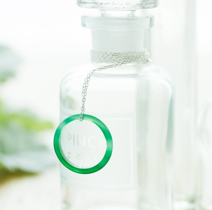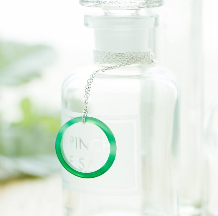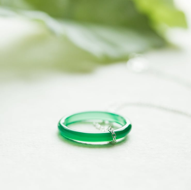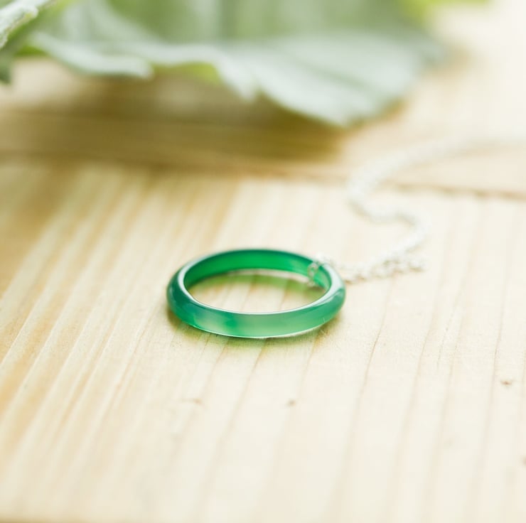 A gorgeous, minimalist ring necklace in a beautiful jade green. Each is slightly different, so yours will be in the jade green family, but won't necessarily be the same exact shade. So it'll be the same gorgeous colour, but not necessarily the same shade... it will, though, be equally delicate and elegant.