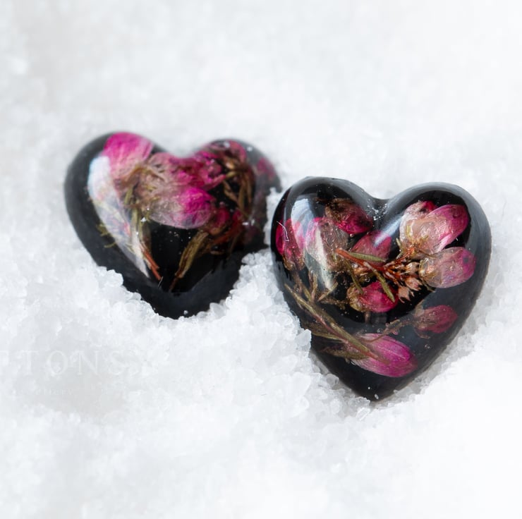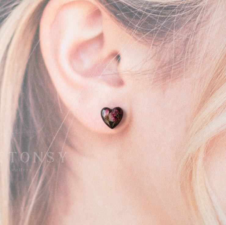 These teeny, tiny beautiful real flower earrings are filled with heather flowers and leaves. The gorgeous pinkyred of the petals is complemented by green glitters that catch the light as you move your head. Lovely! They are set against a black background to make sure the colours POP!