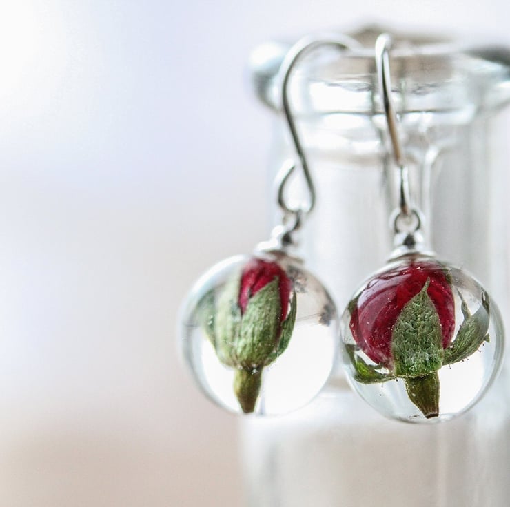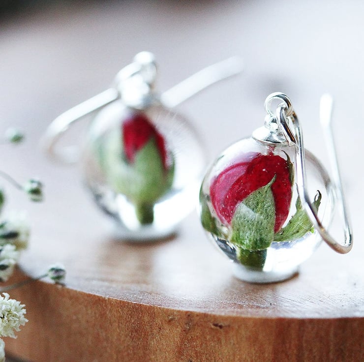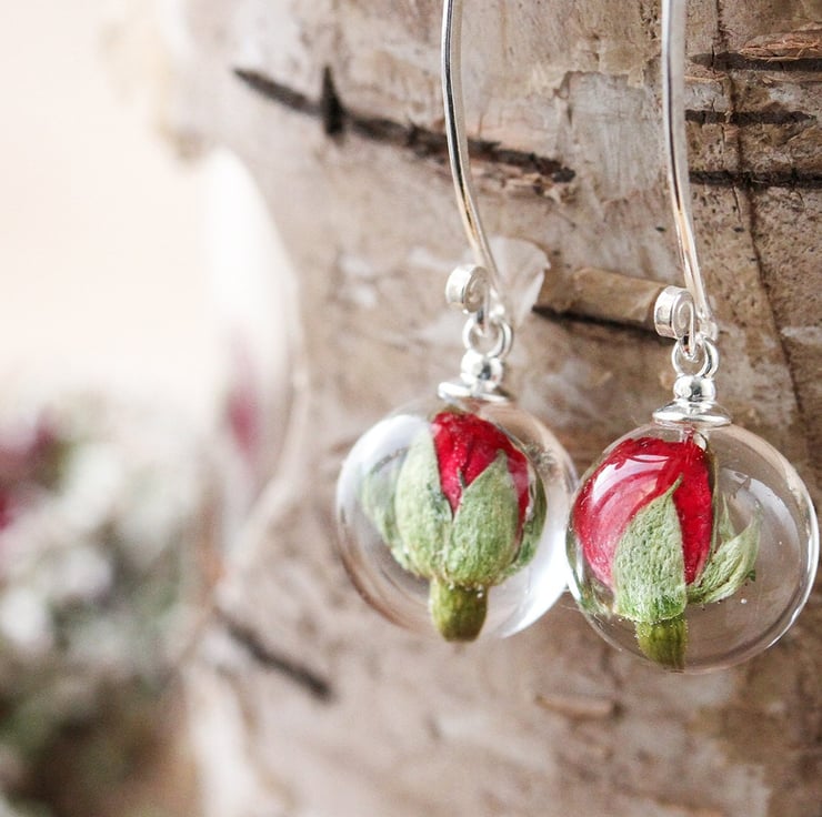 Rose Bud Earrings Tiny Rose Globes Real Flower Earrings Red Roses Pressed Flower