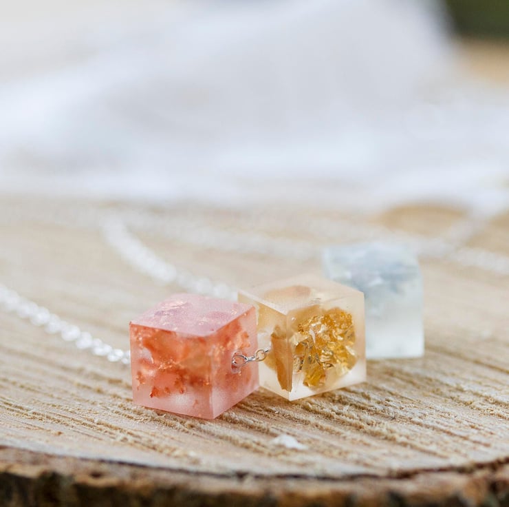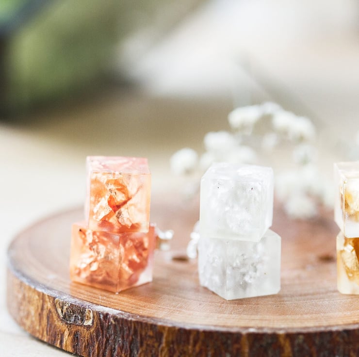These beautiful earrings are perfect tiny cubes, filled with real copper leaf... they are stunning, and you can lose time just looking inside of them, seeing how the precious metal flakes catch the light. They have been lightly frosted - we experimented with making them crystal clear, and the slight frosting made them ever so much more beautiful. The frosting gives them a matte surface, but still allows you to see every flake and flare of copper.