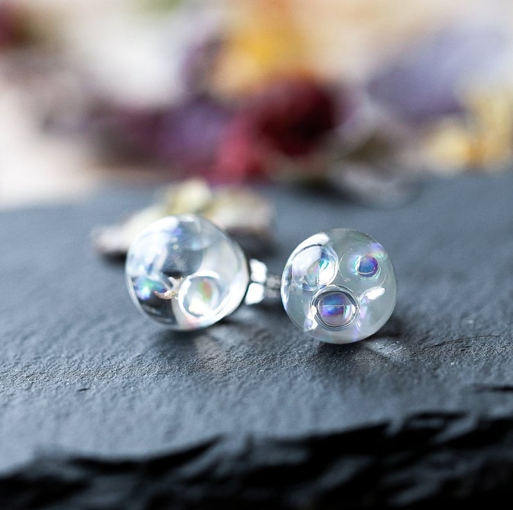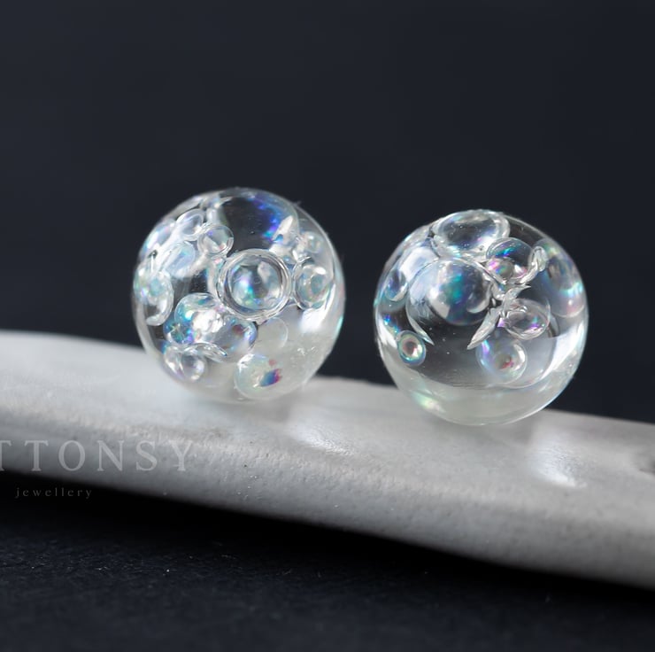 A perfect pair of bubbles... beautiful, beautiful rainbow bubbles that change colour as they catch the light from different angles; the bubbles are swirling throughout the earrings, all different sizes, like they've just been blown. We have captured something as fleeting as bubbles, and made them keepable for always 3