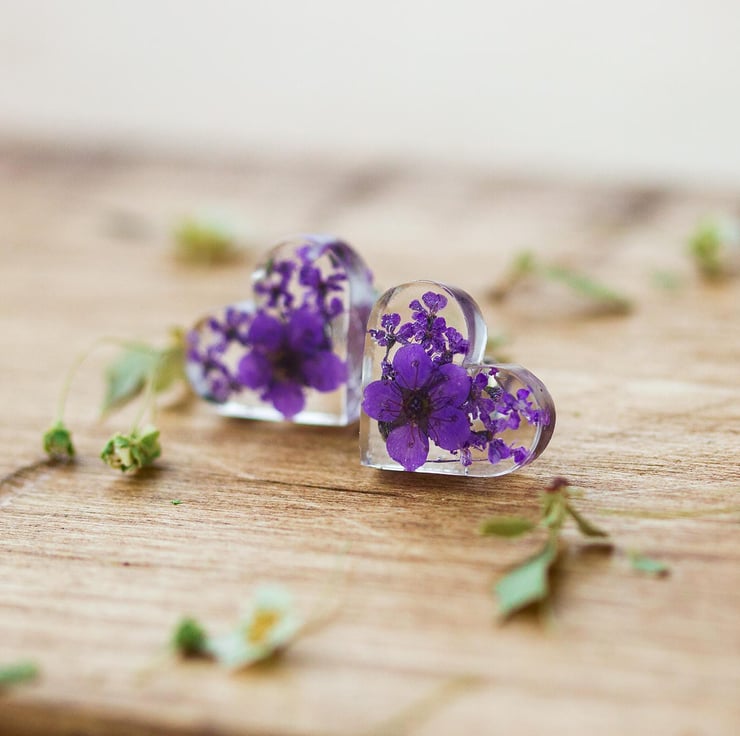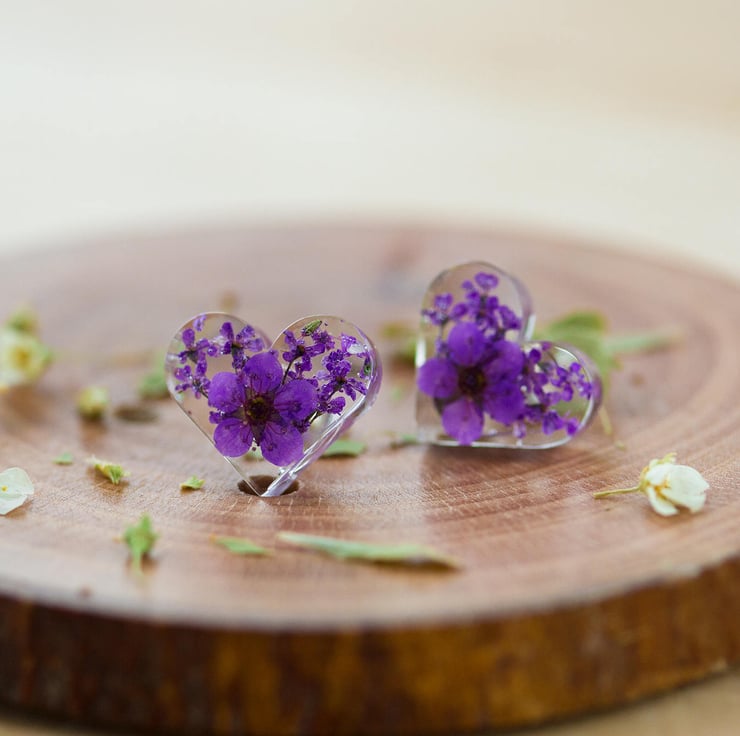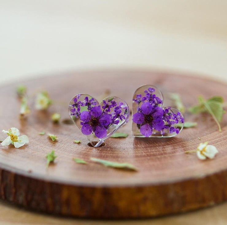 Flower Earrings Purple Hearts Sterling Silver Handmade Jewelry Pressed Flowers N