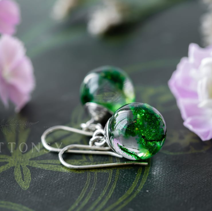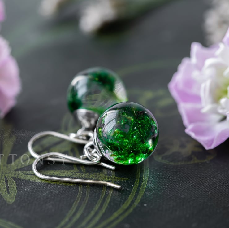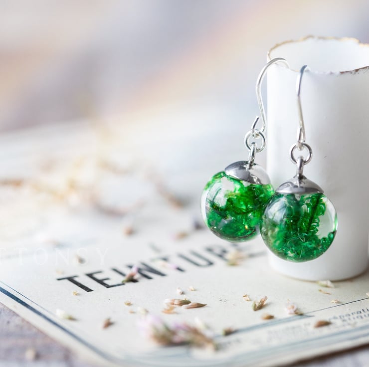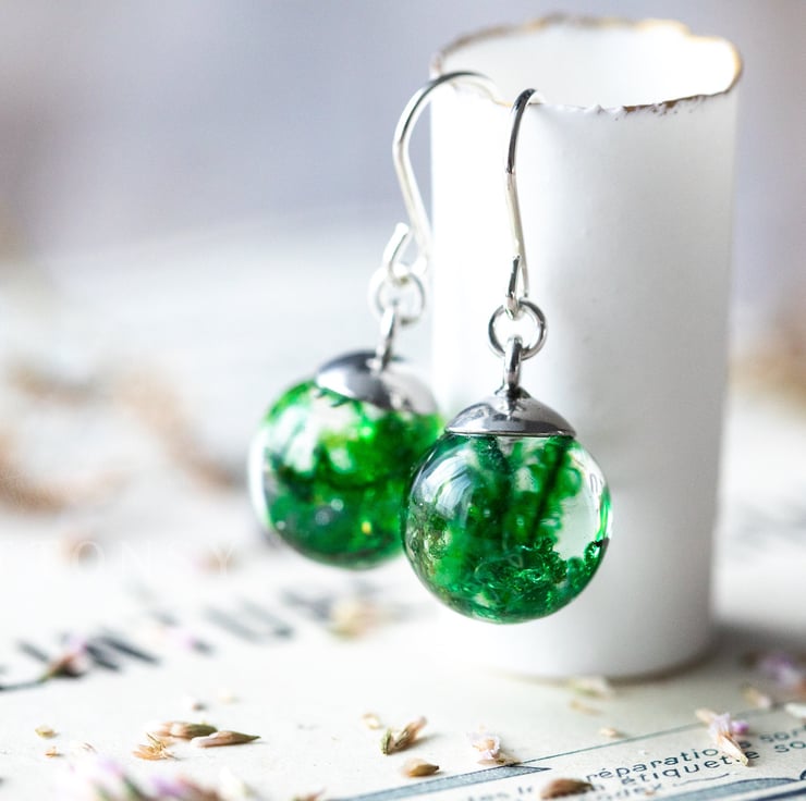 A beautiful pair of real moss earrings... these are for romantic nights and summer evenings; luxurious, emerald green moss held forever in UV-stable, extra strong crystal clear resin, with sterling silver ear wires.