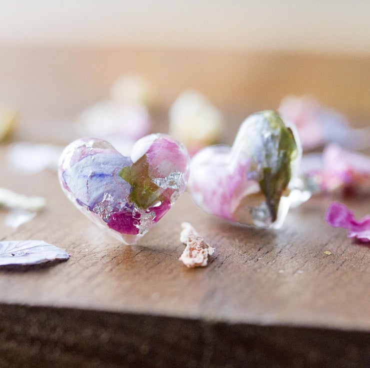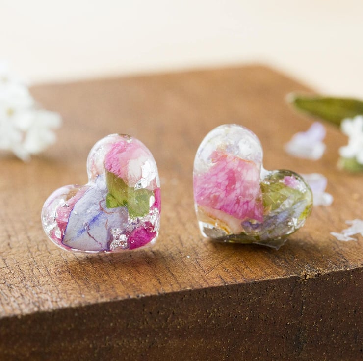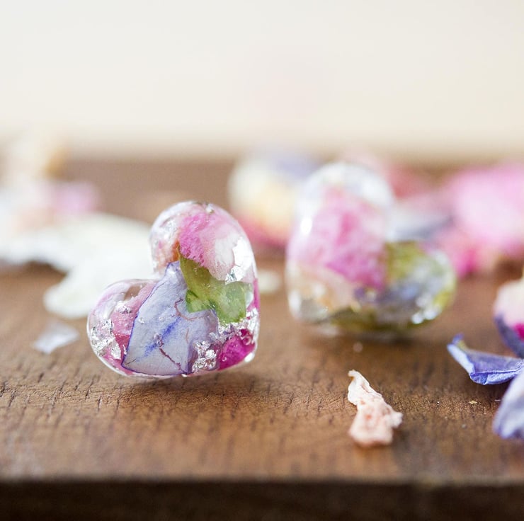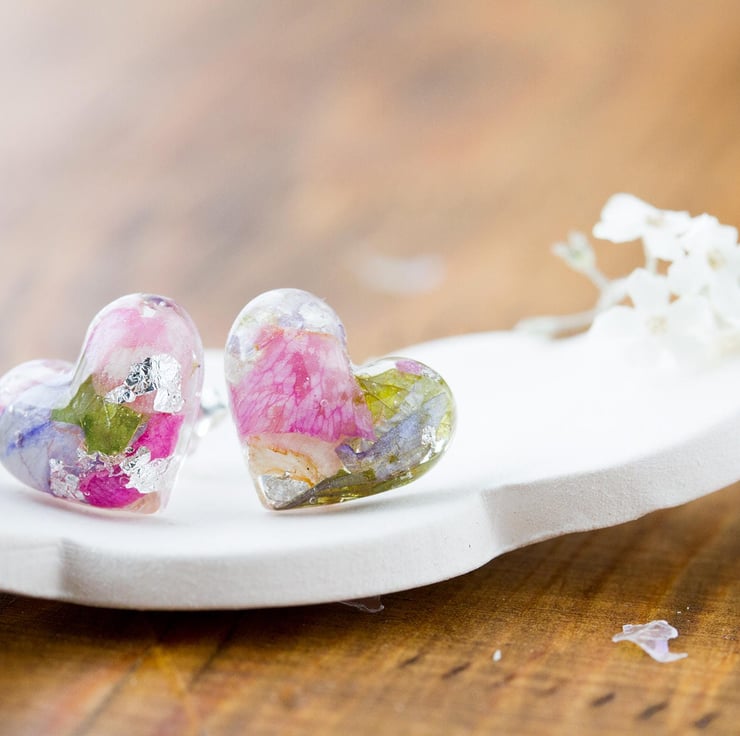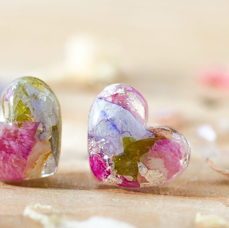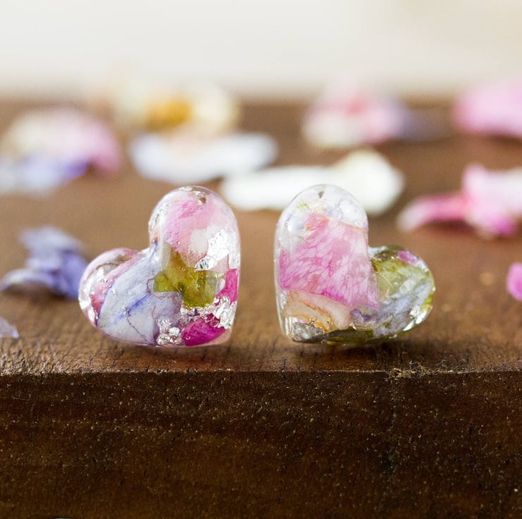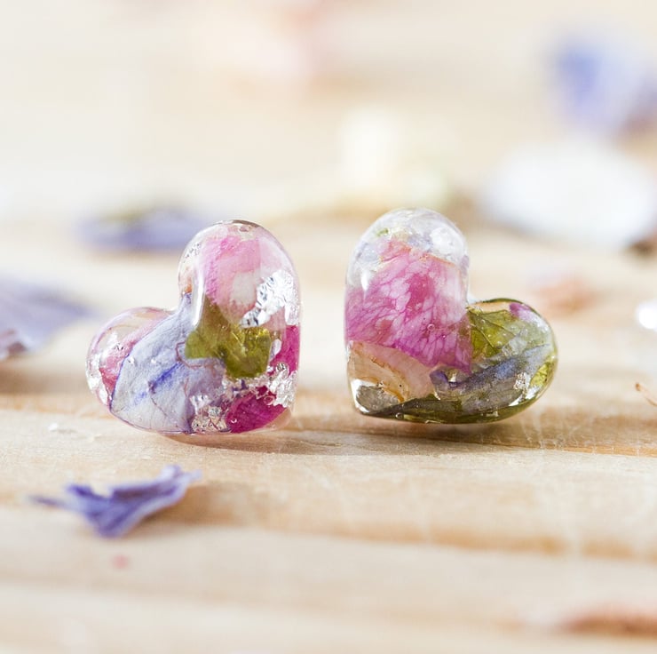These beautiful real flower earrings are filled with real petals - specifically wildflowers! They are pinks, blue and green with real silver flakes that catch the light as you move your head. Lovely!