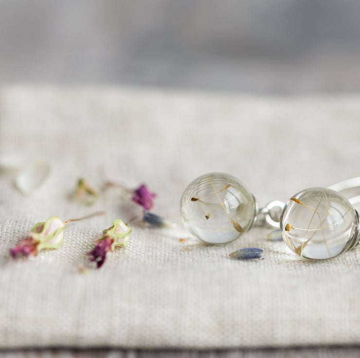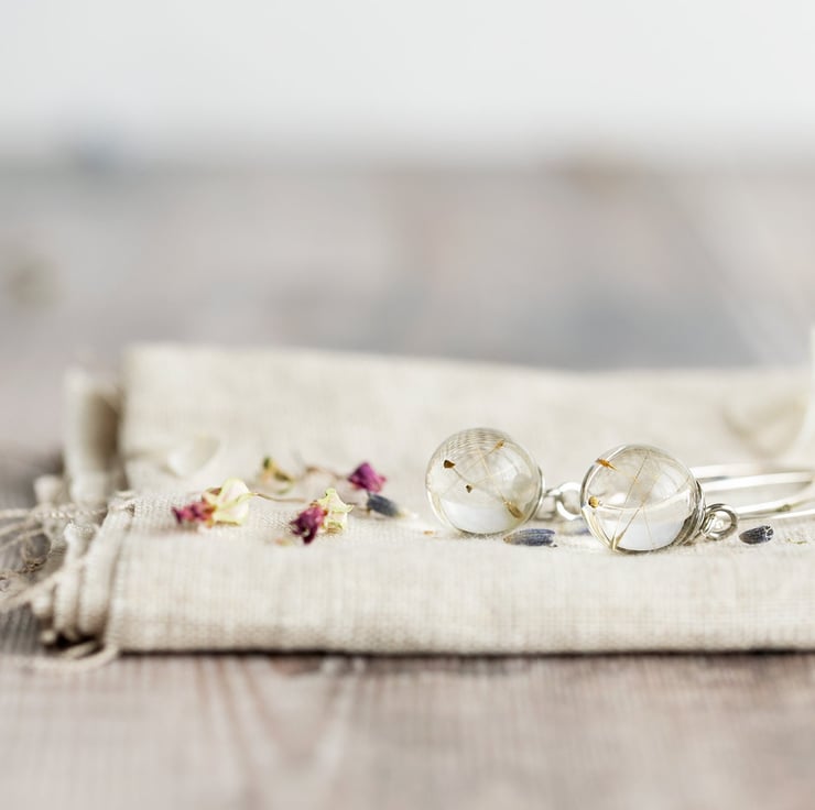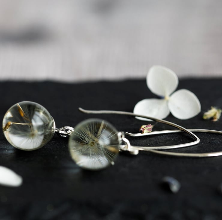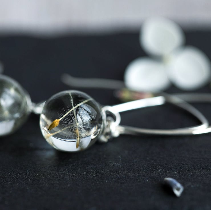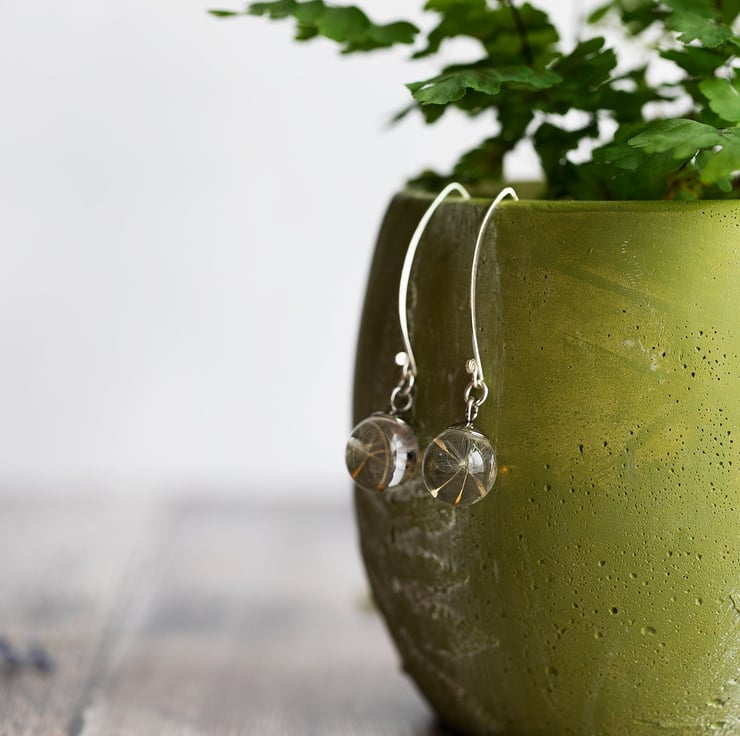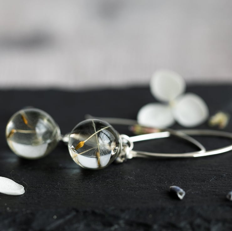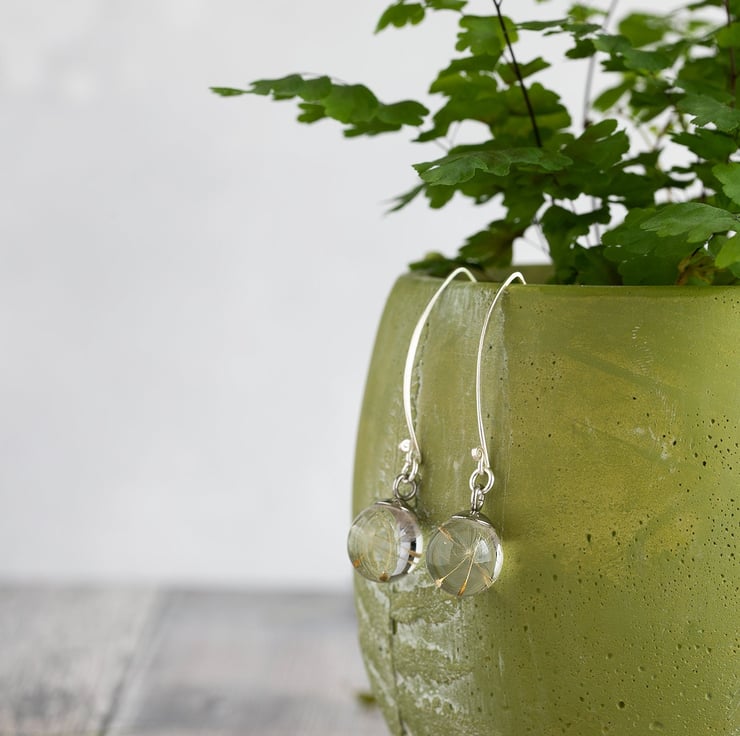 Tiny resin globes filled with real dandelion wishes hang from handmade 35mm sterling silver threader earrings.
