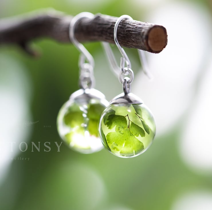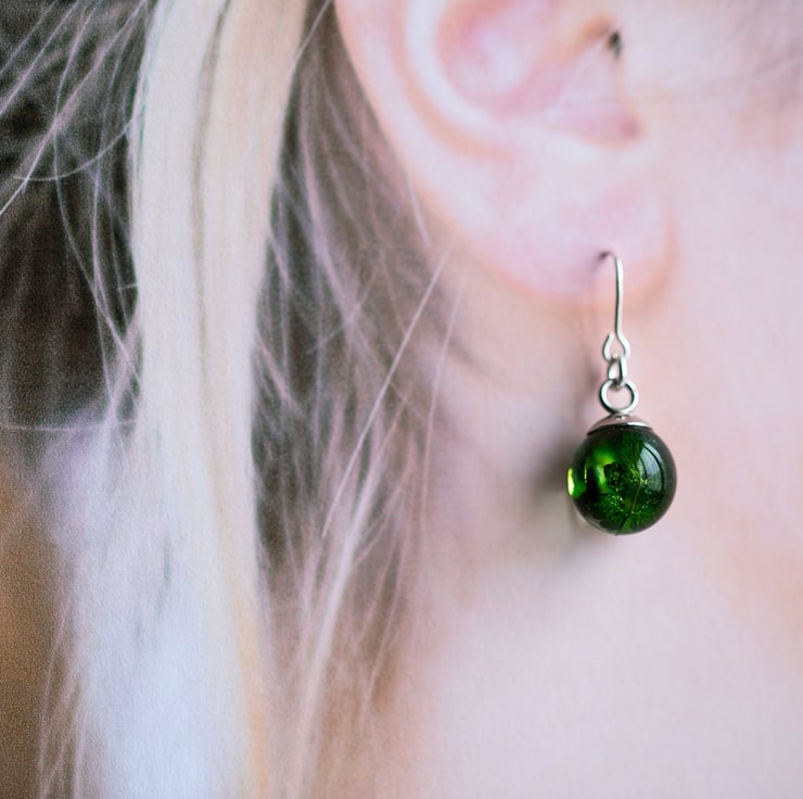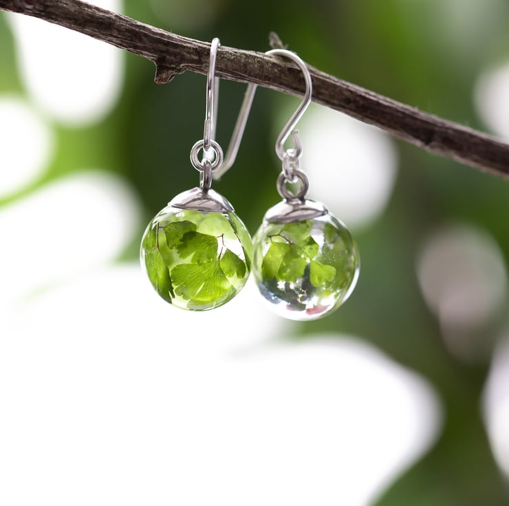 A beautiful pair of real leaf earrings... these are for romantic nights and summer evenings; luxurious, emerald green maidenhair fern leaves caught forever in UV-stable, extra strong crystal clear resin, with sterling silver ear wires.