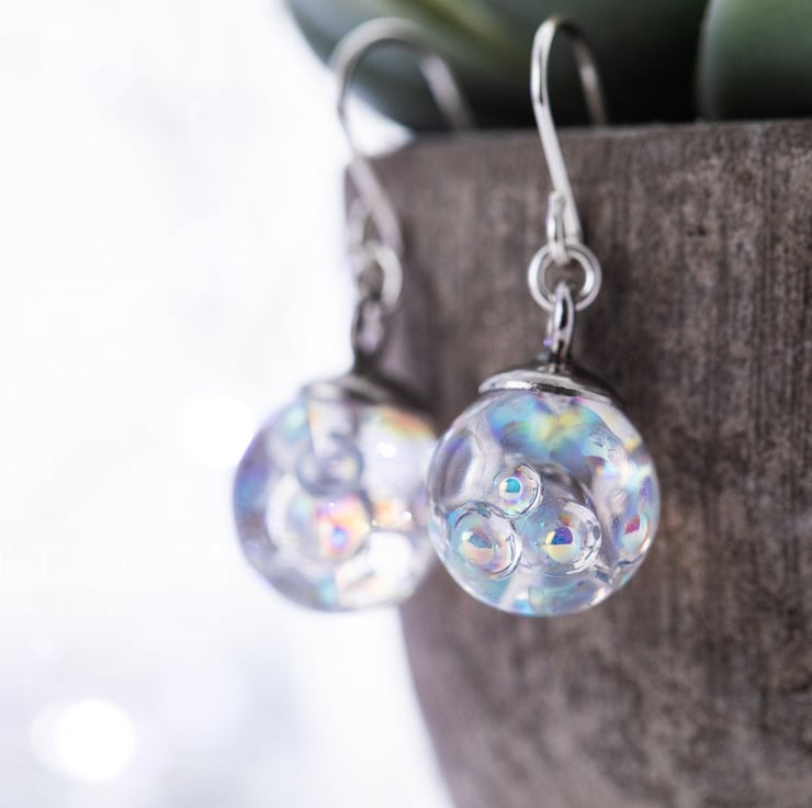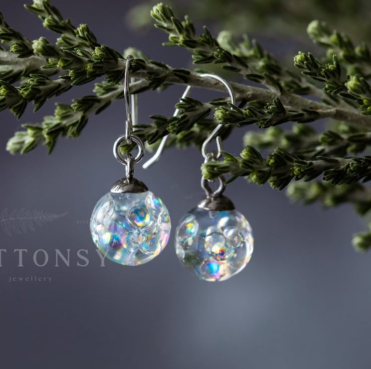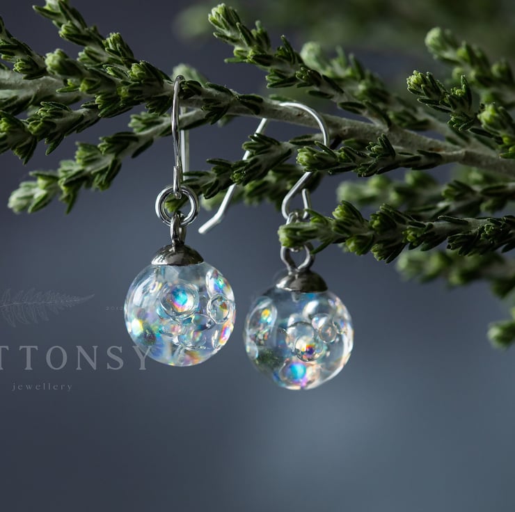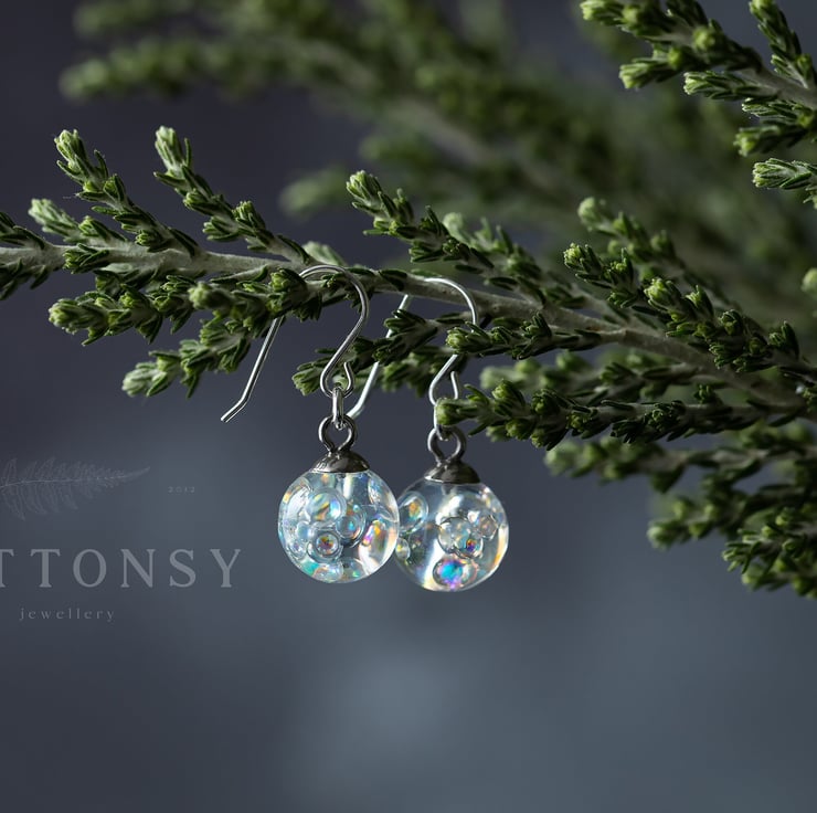 Globes of fairy bubbles... beautiful, beautiful rainbow bubbles that change colour as they catch the light from different angles; the bubbles are swirling throughout the earrings, all different sizes, like they've just been blown. We have captured something as fleeting as bubbles, and made them keepable for always 3